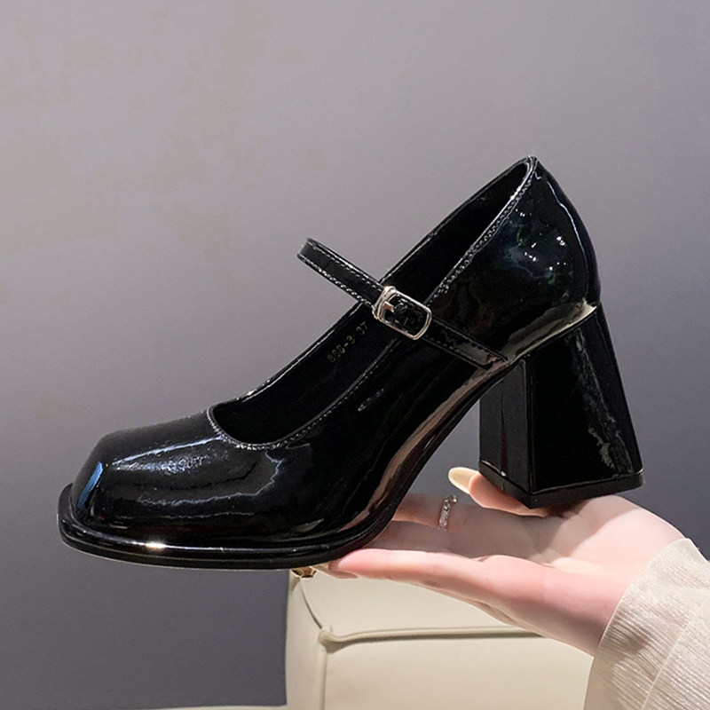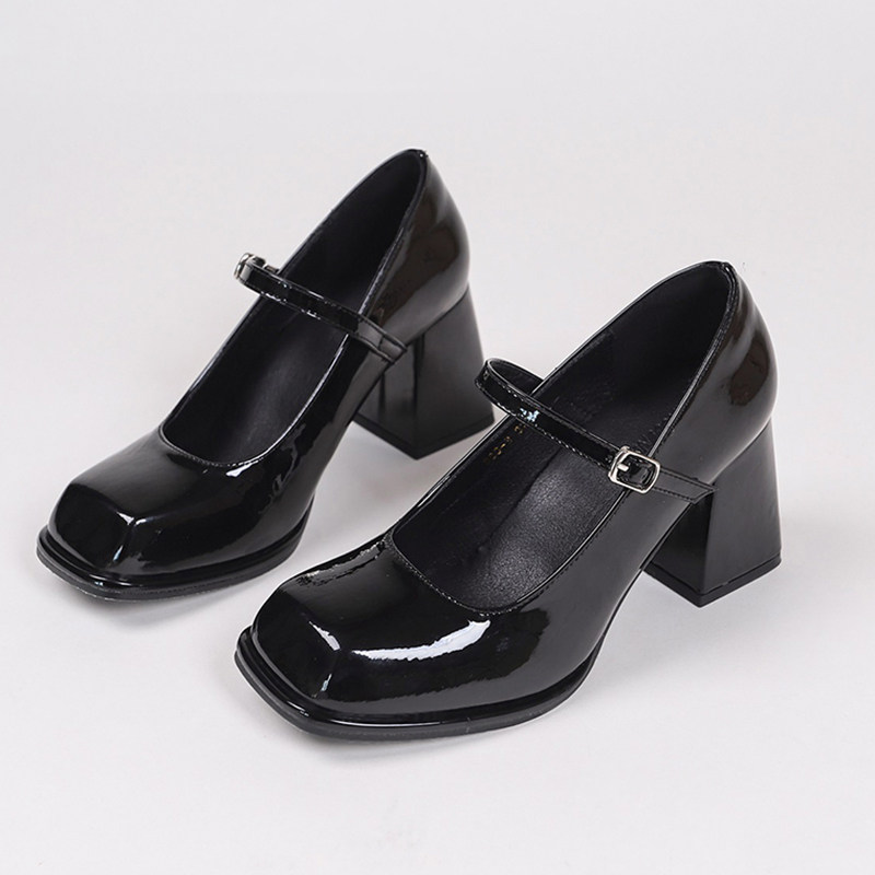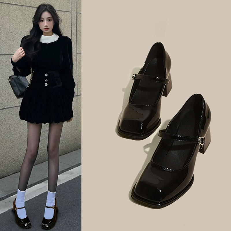 真皮~法式复古黑色高跟鞋2025春季一字带通勤工作粗跟玛丽珍单鞋
