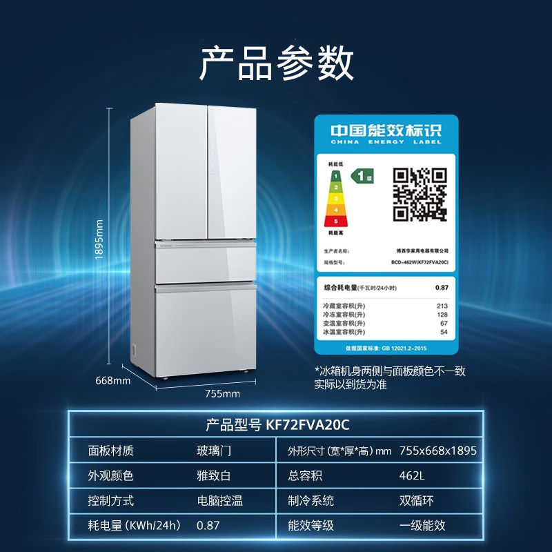 西门子462L零度法式多门白色冰箱双系统双循环玻璃门一级变频VA20