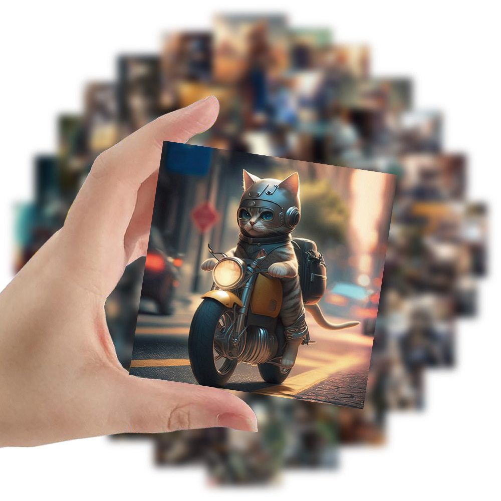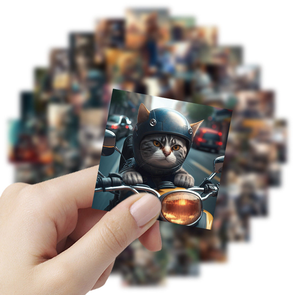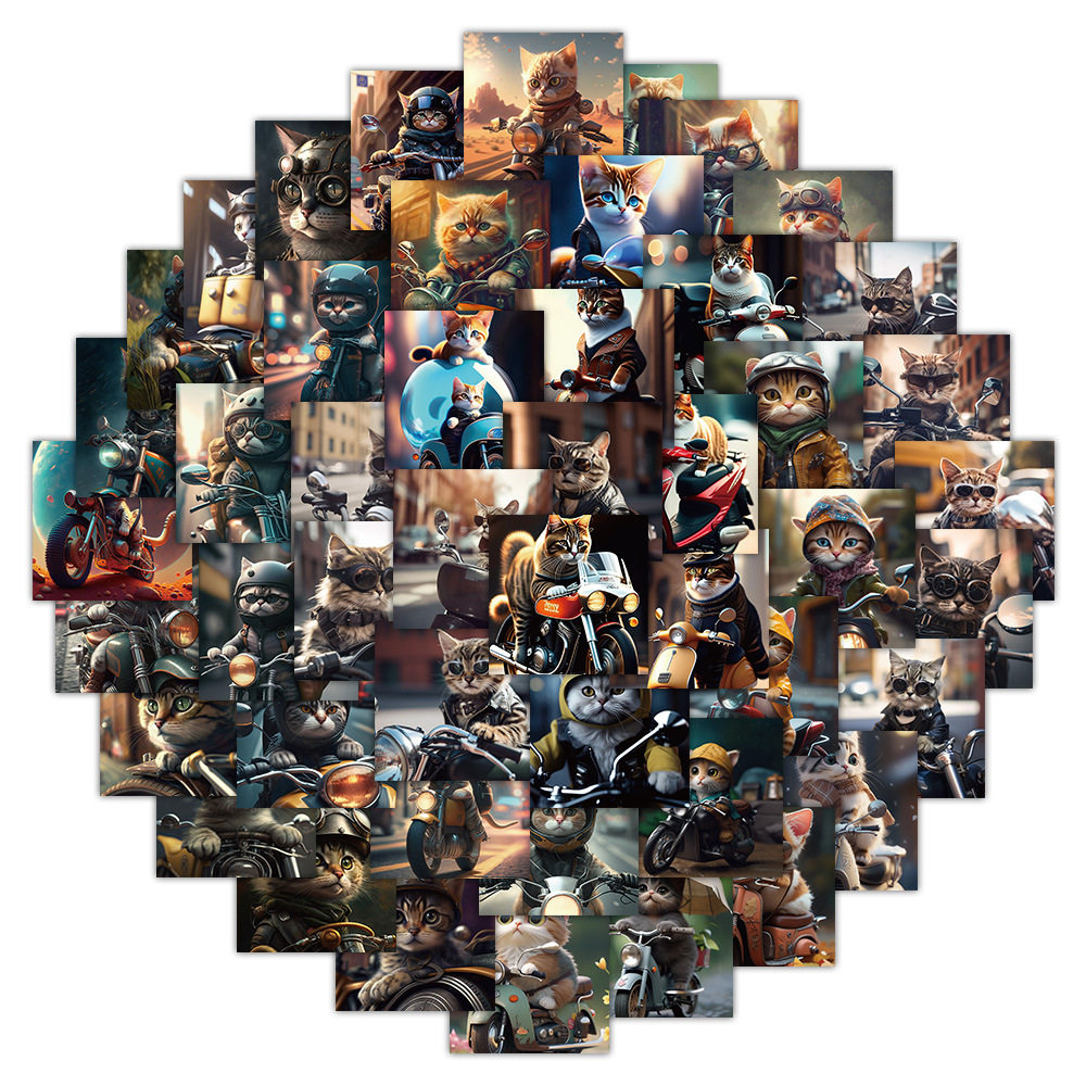 60张骑摩托的猫手账贴纸炫酷机车小猫 装饰笔记本手机壳贴画
