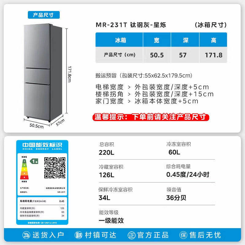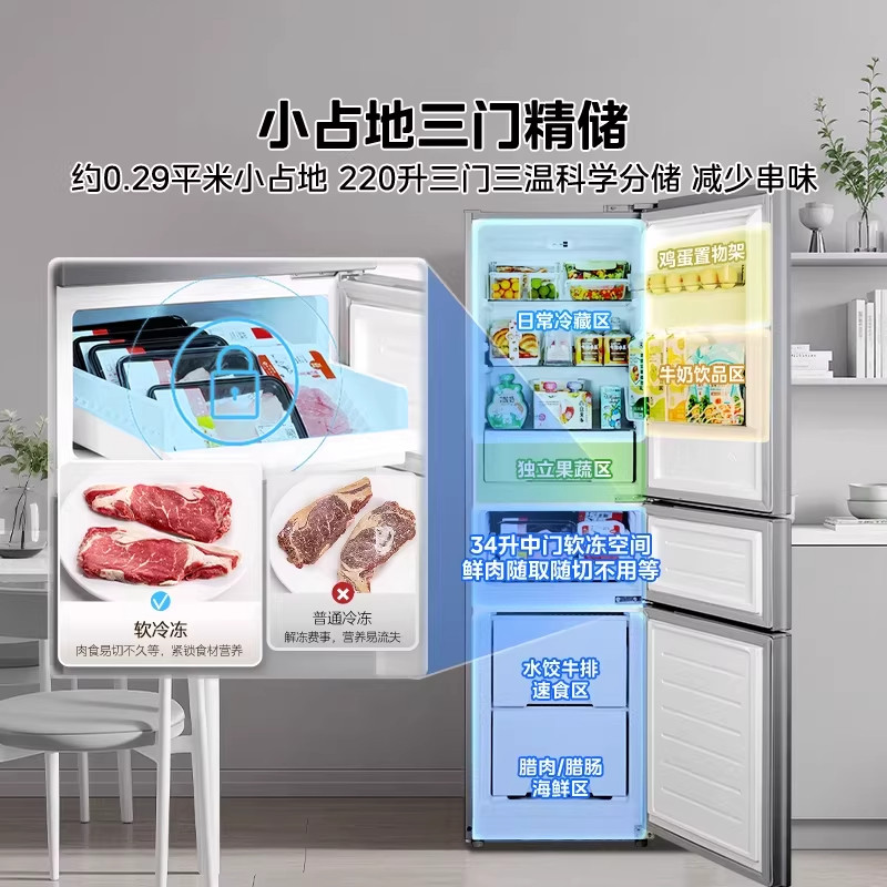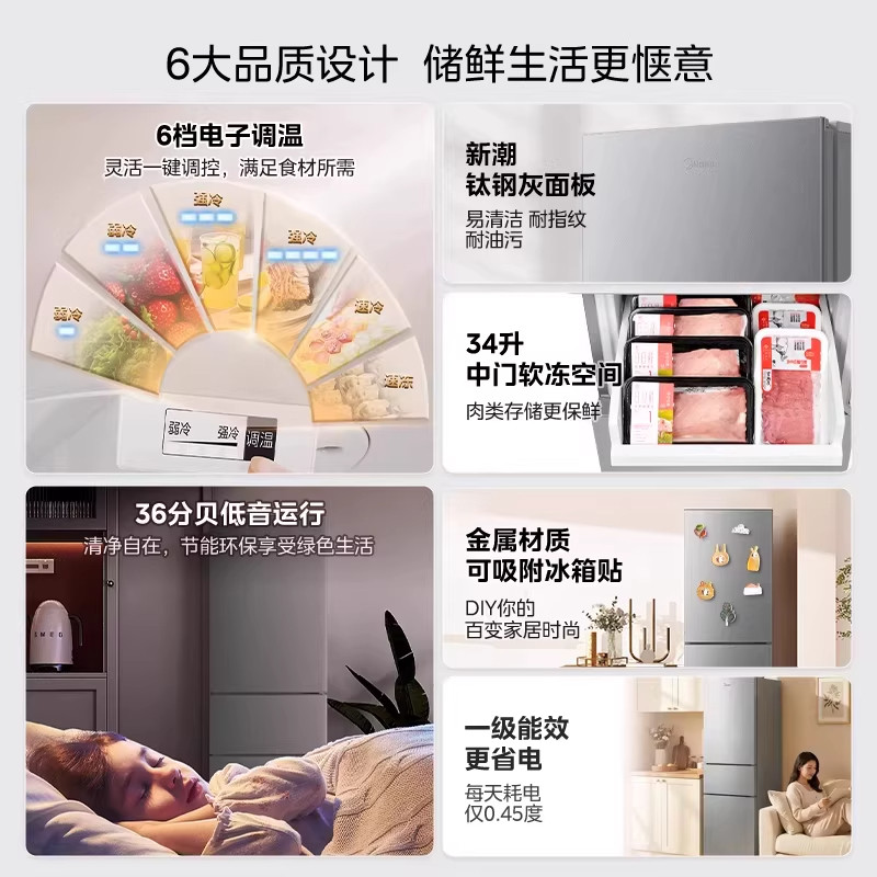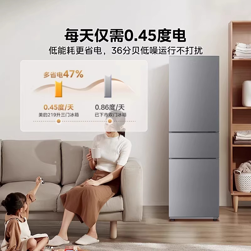 美的231三门电冰箱家用小型出租屋宿舍租房低噪冷藏冷冻一级节能