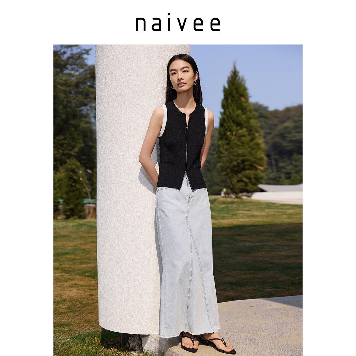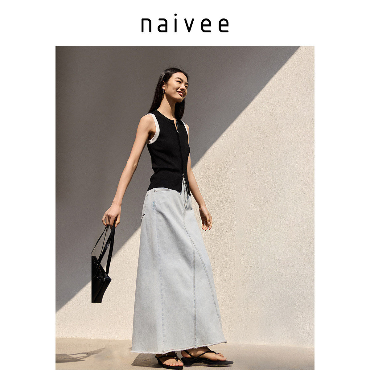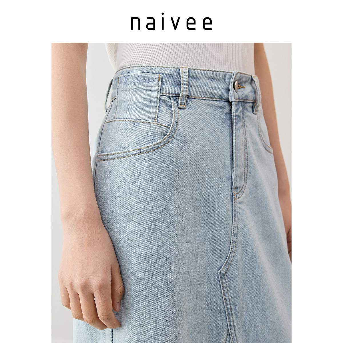 商场同款naivee纳薇浅色牛仔裙女25夏新款度假风休闲宽松a字长裙