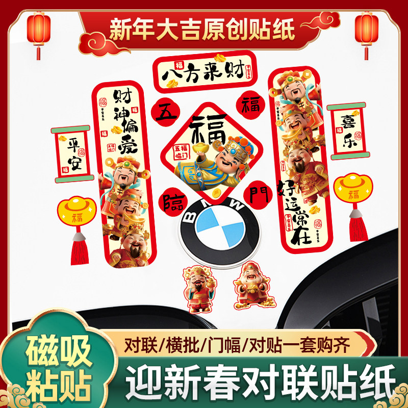 2026新年款马年磁性吸对联贴财神爷福字电动汽车贴春联车门窗贴纸