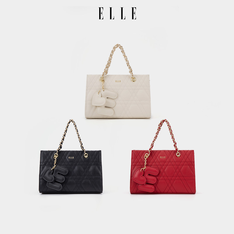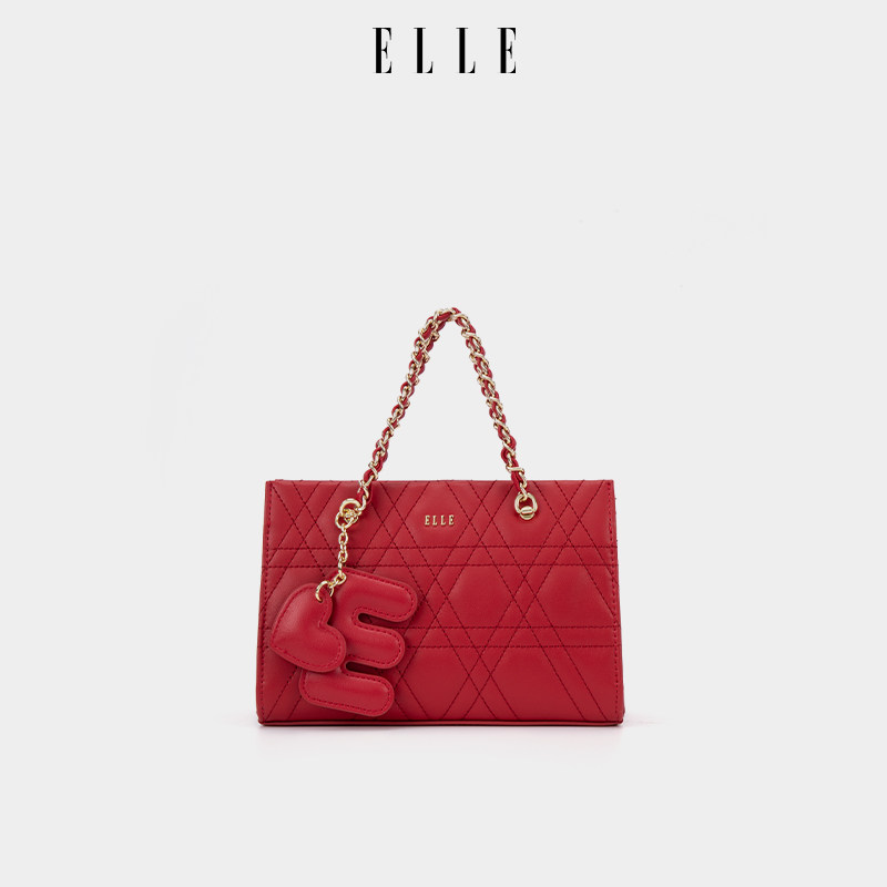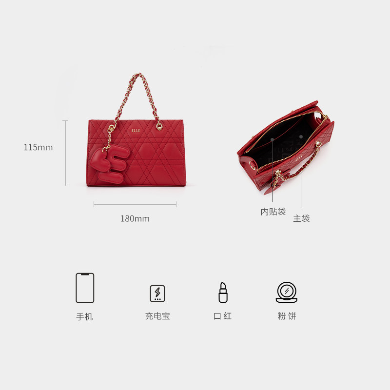 ELLE女包2026新款包包菱形格链条单肩女黑色真皮包黑色超火托特包