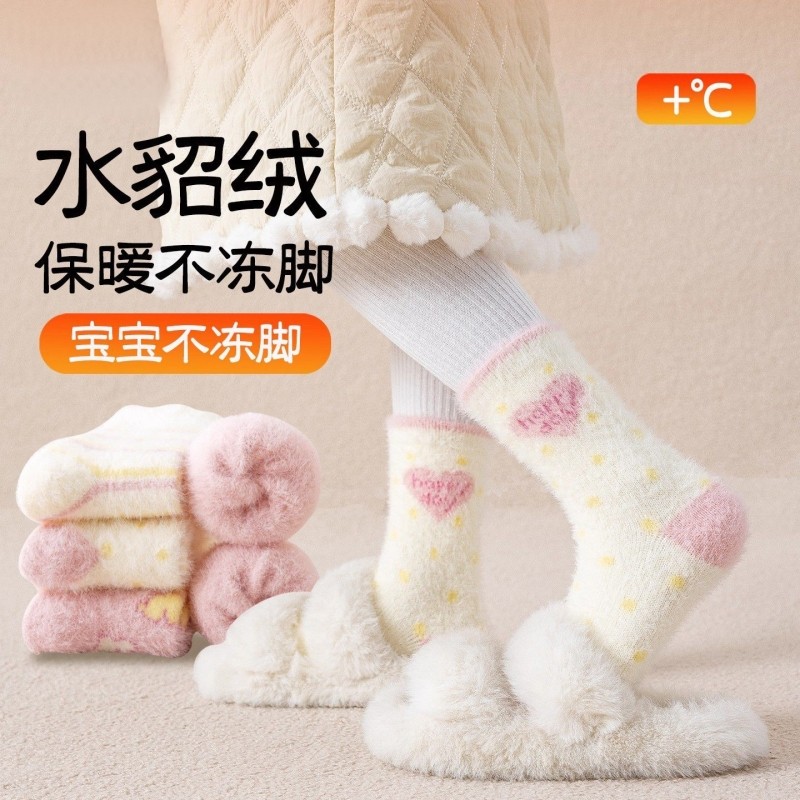 女童秋冬季可爱冬款加绒水貂绒粉色中筒袜儿童加厚保暖睡眠袜加长