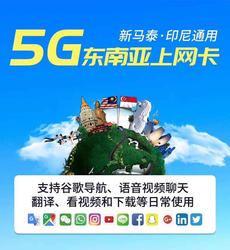 新马泰印四国通用 5G网络 可选无限流量 插卡即用 送卡针 送转换插头 支持热点共享与续费