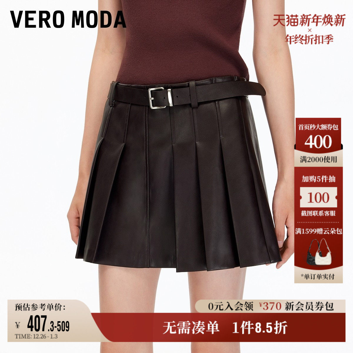 Vero Moda奥莱半身裙女2025秋冬新款腰带PU百褶裙显高显瘦裙子
