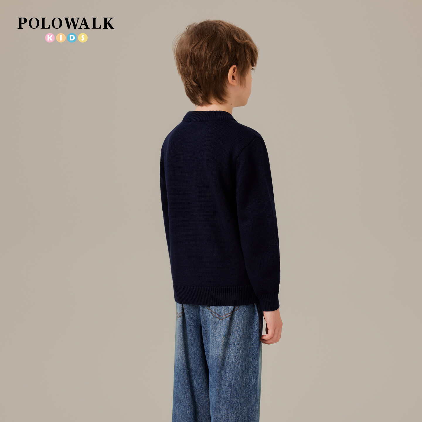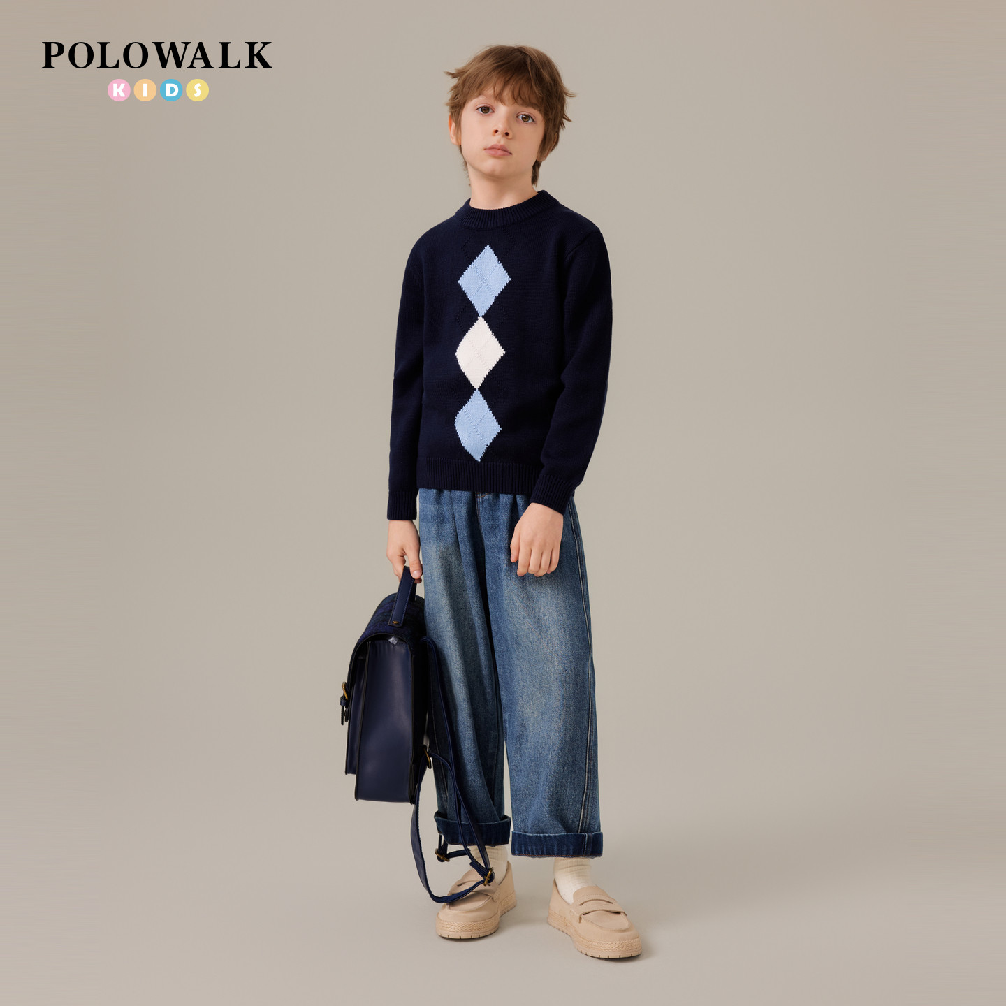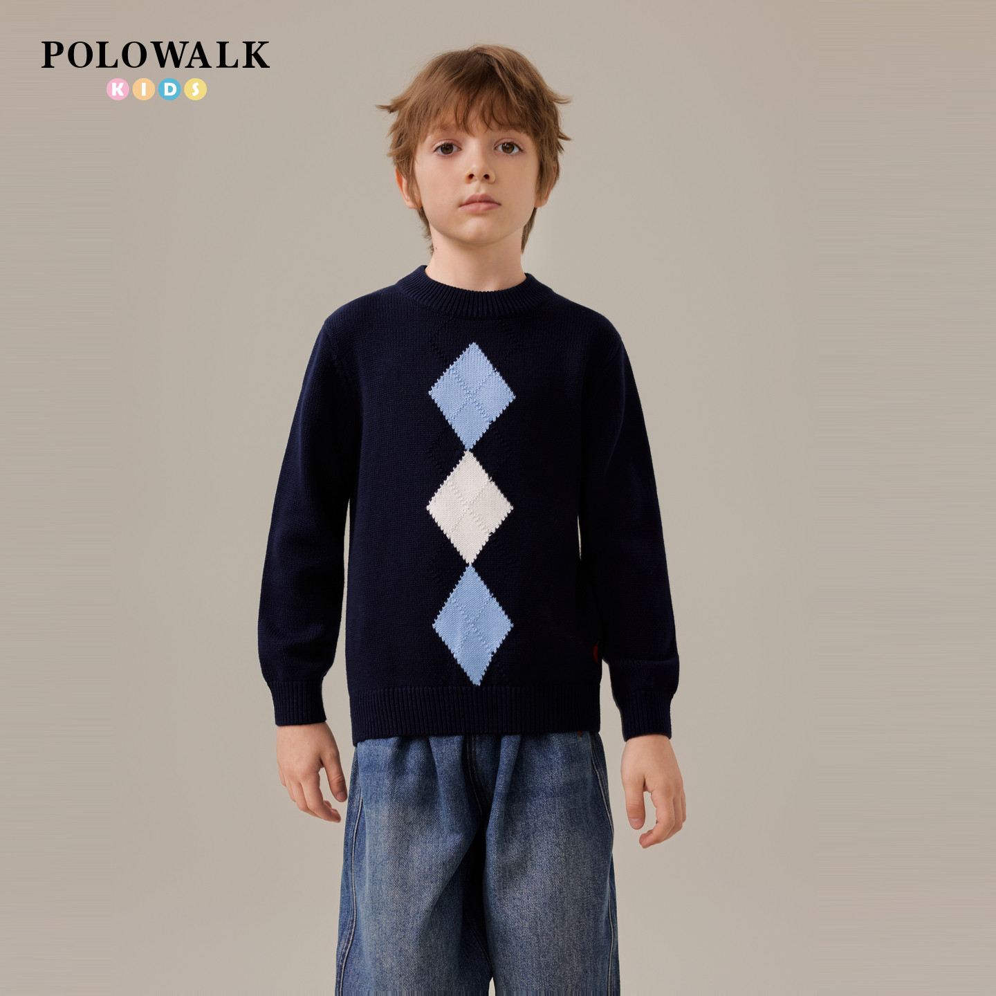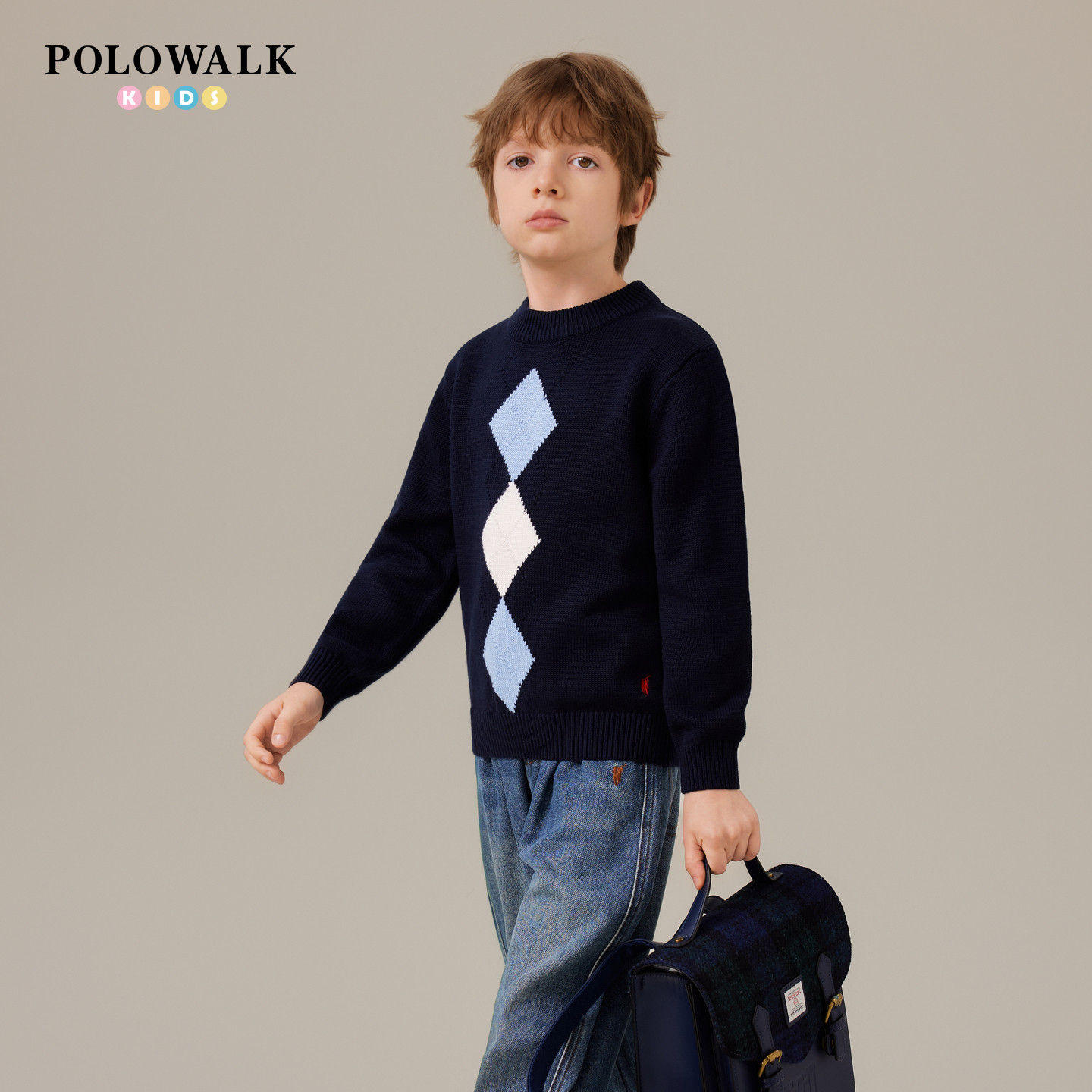 POLOWALK童装男童针织衫2025秋冬新款圆领线衫撞色菱形提花毛衣