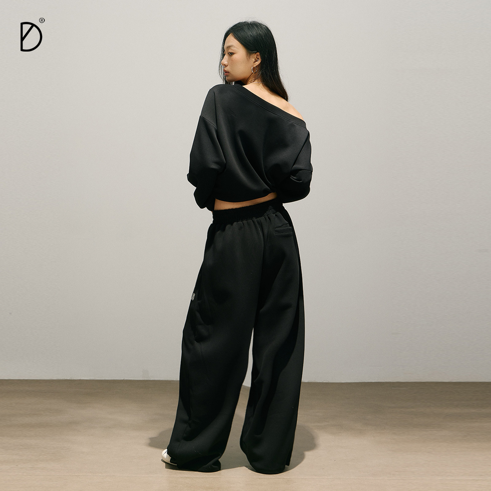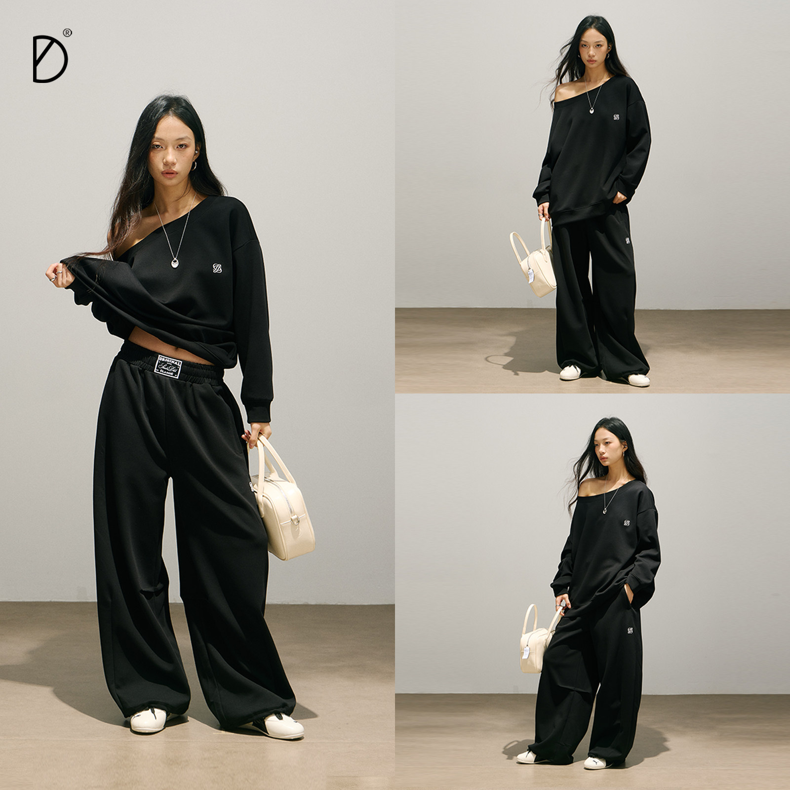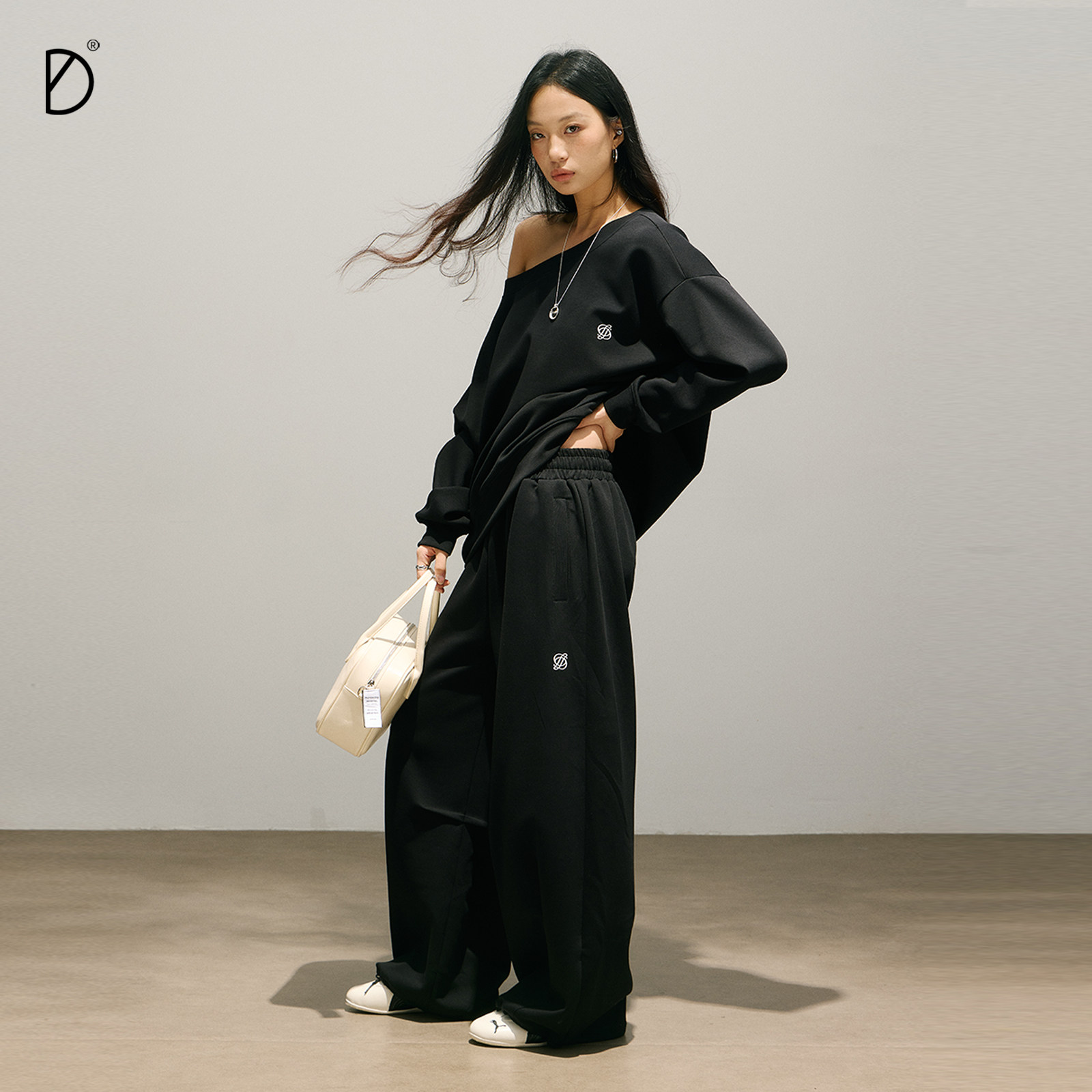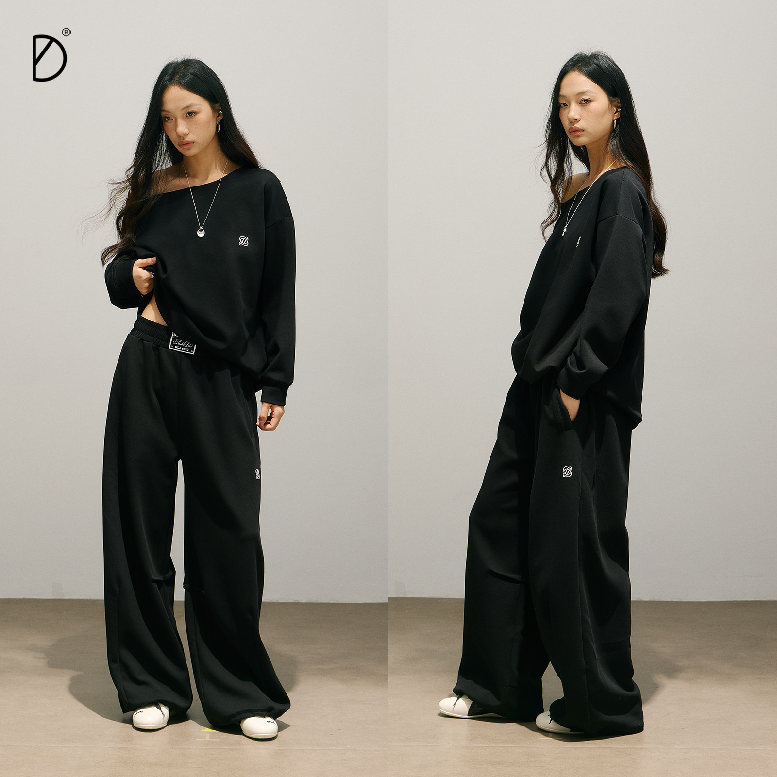 SMILE DDD斜肩套装黑色220g舒适亲肤裤脚可调节美式慵懒休闲卫衣