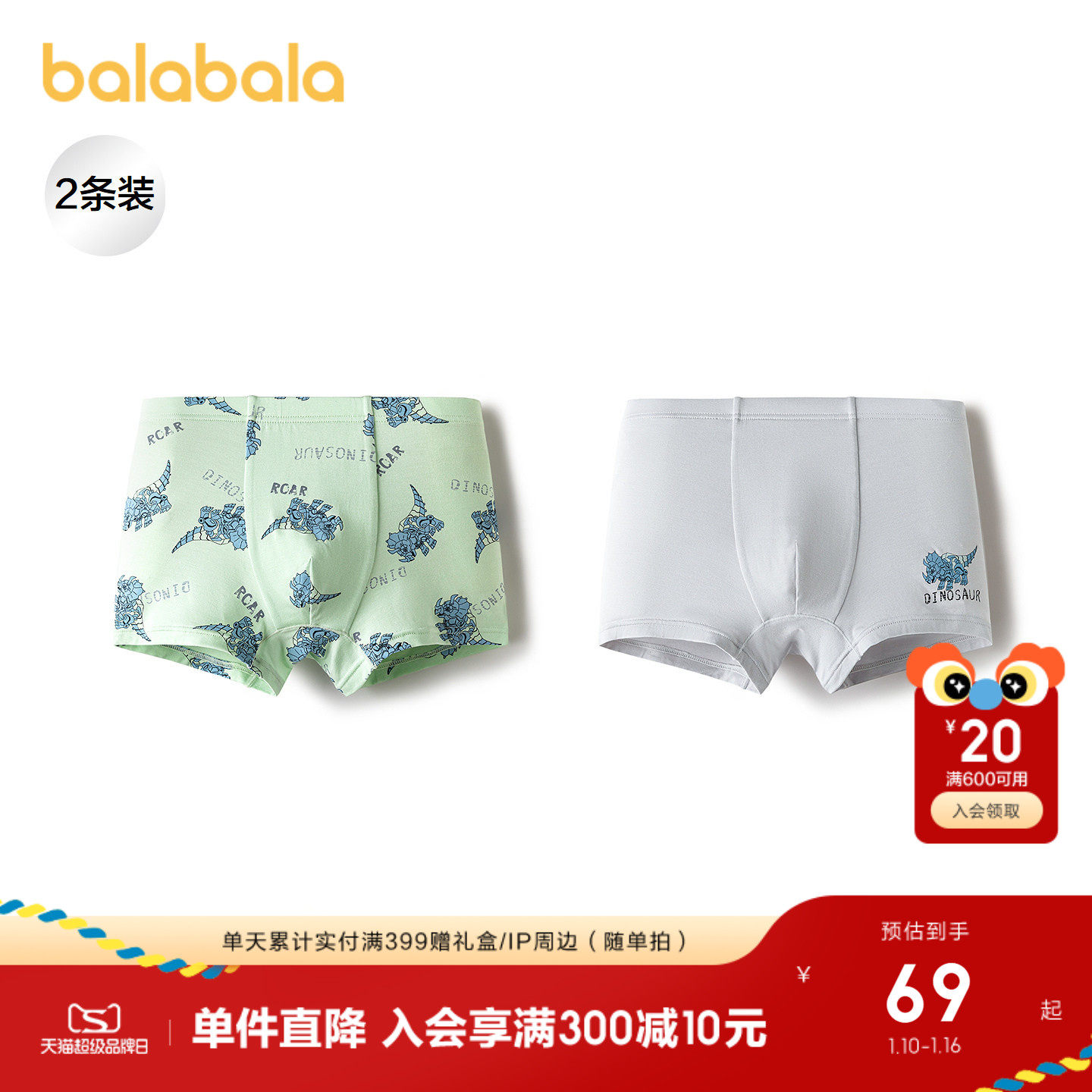 【商场同款】巴拉巴拉男童内裤平角儿童四角短裤大童抗菌裆两条装