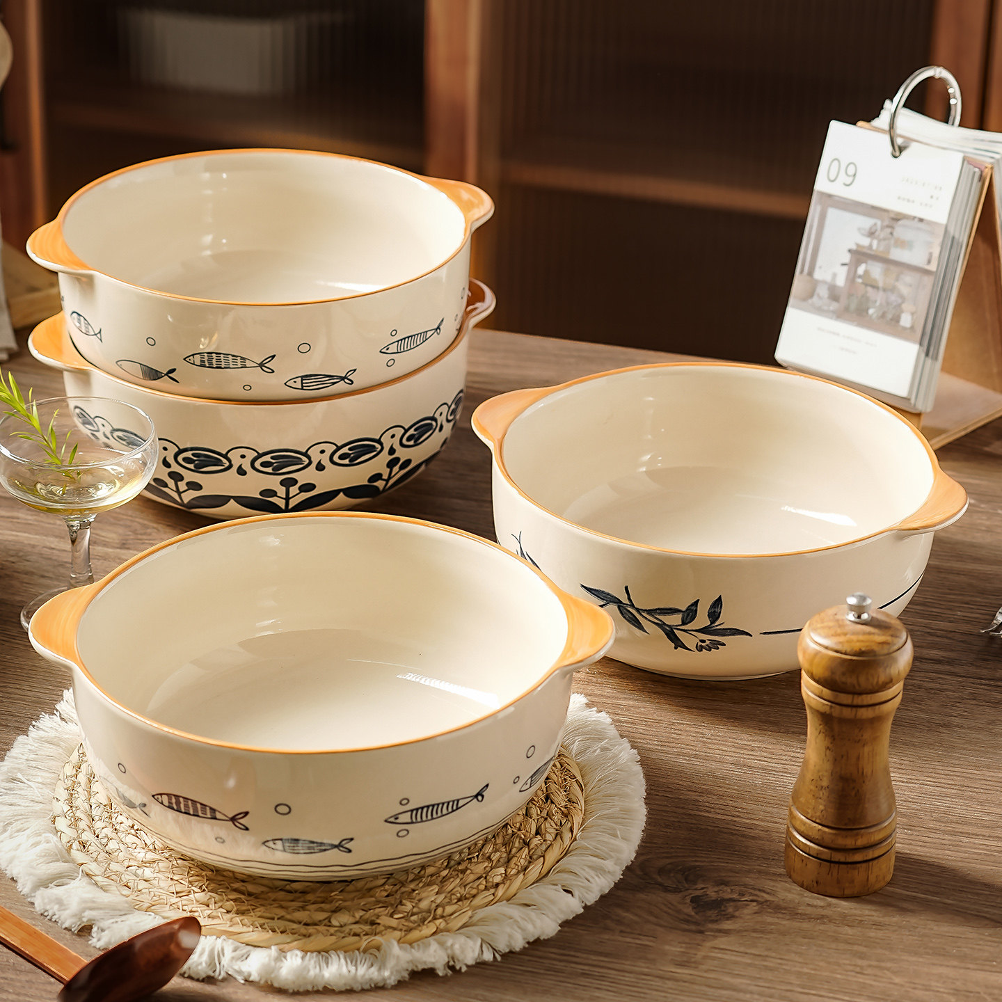烤箱专用陶瓷烤碗家用带手柄碗水果沙拉碗卡通学生宿舍单柄泡面碗