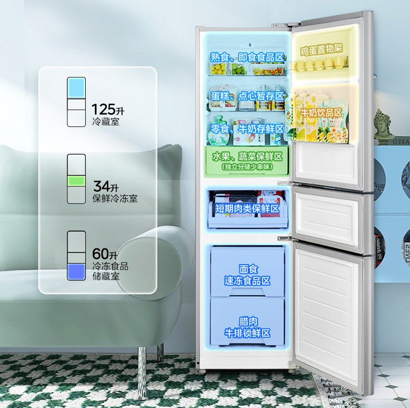 美的出品华凌228冰箱双开三门家用小型一级能效冷冻冷藏租房省电