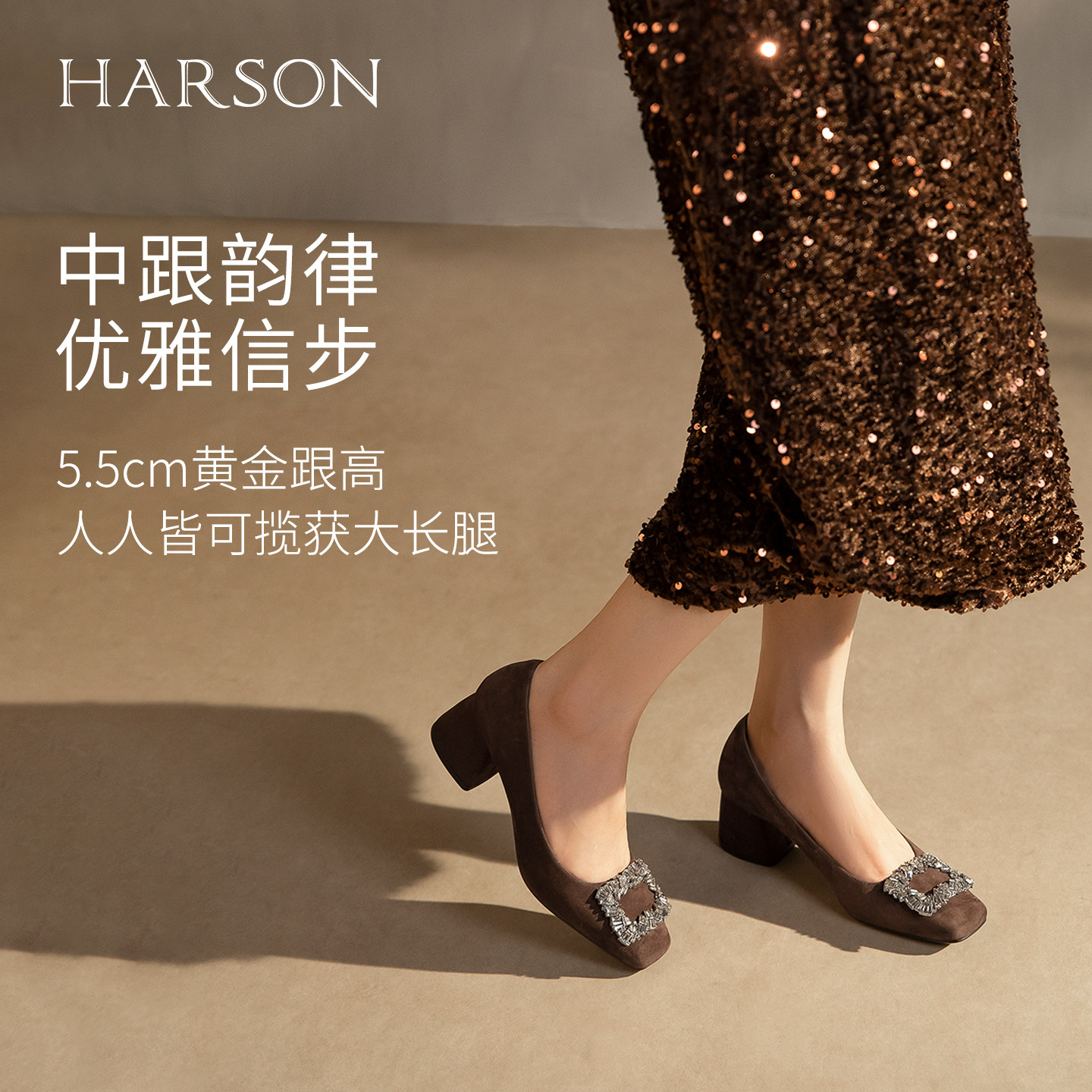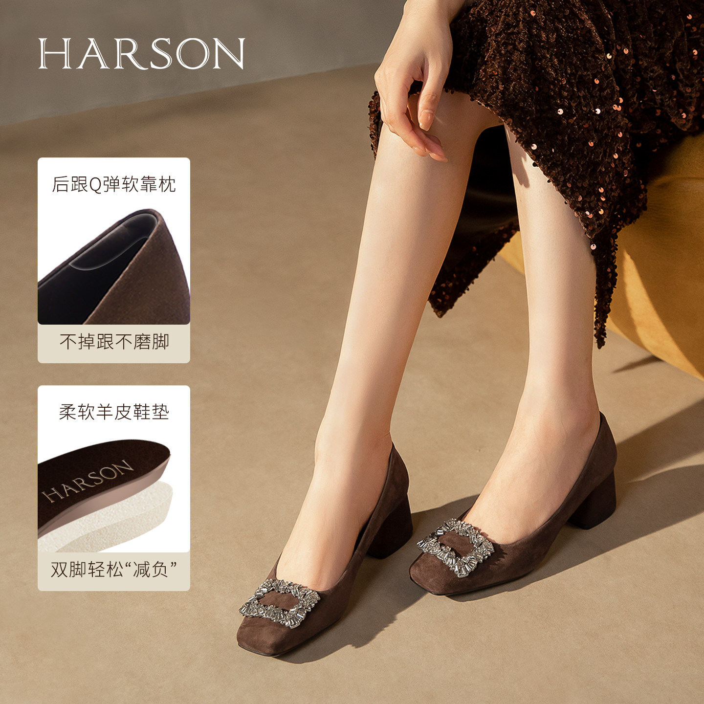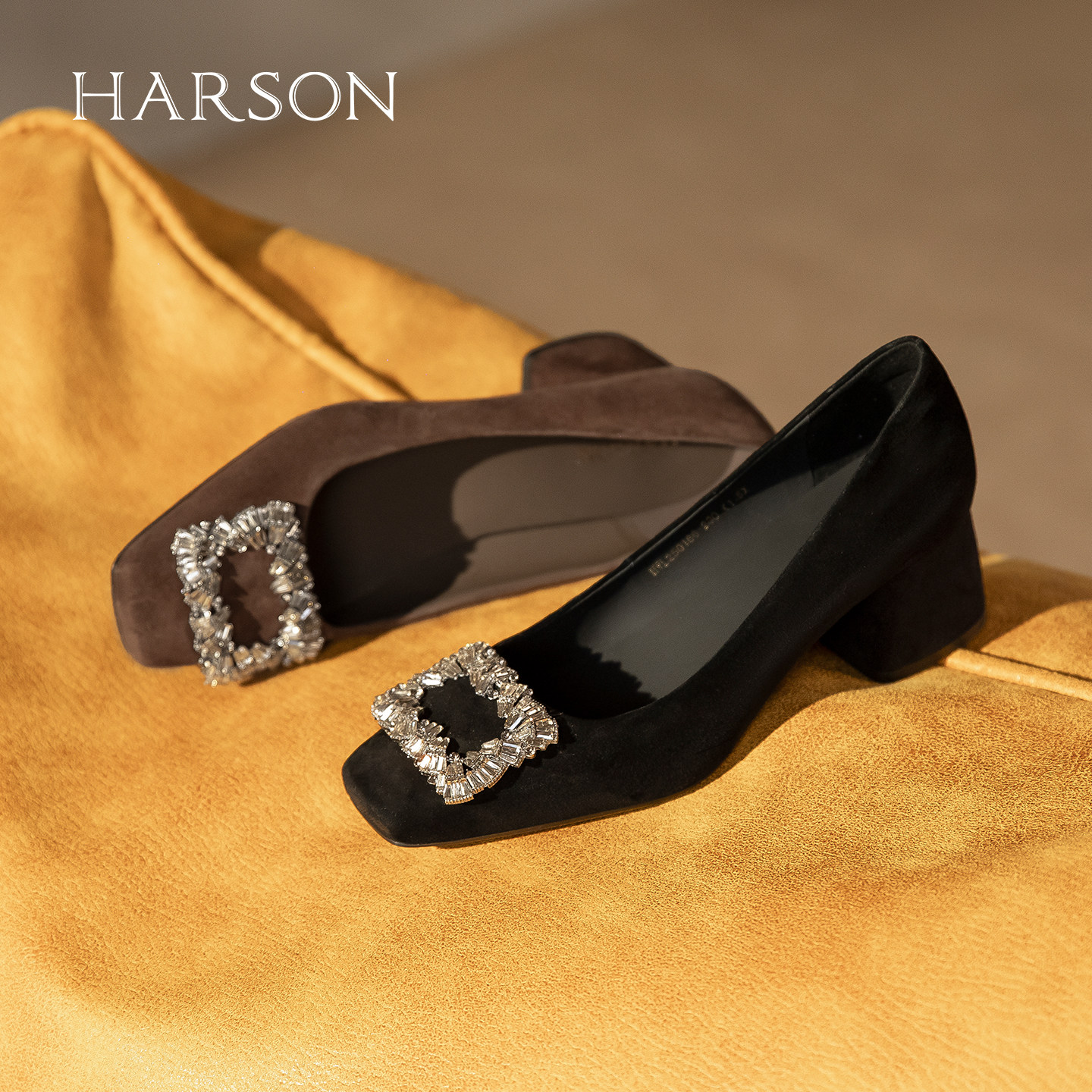 哈森/HARSON【星璨佳人】25新款绒面水钻方扣浅口单鞋粗高跟女鞋