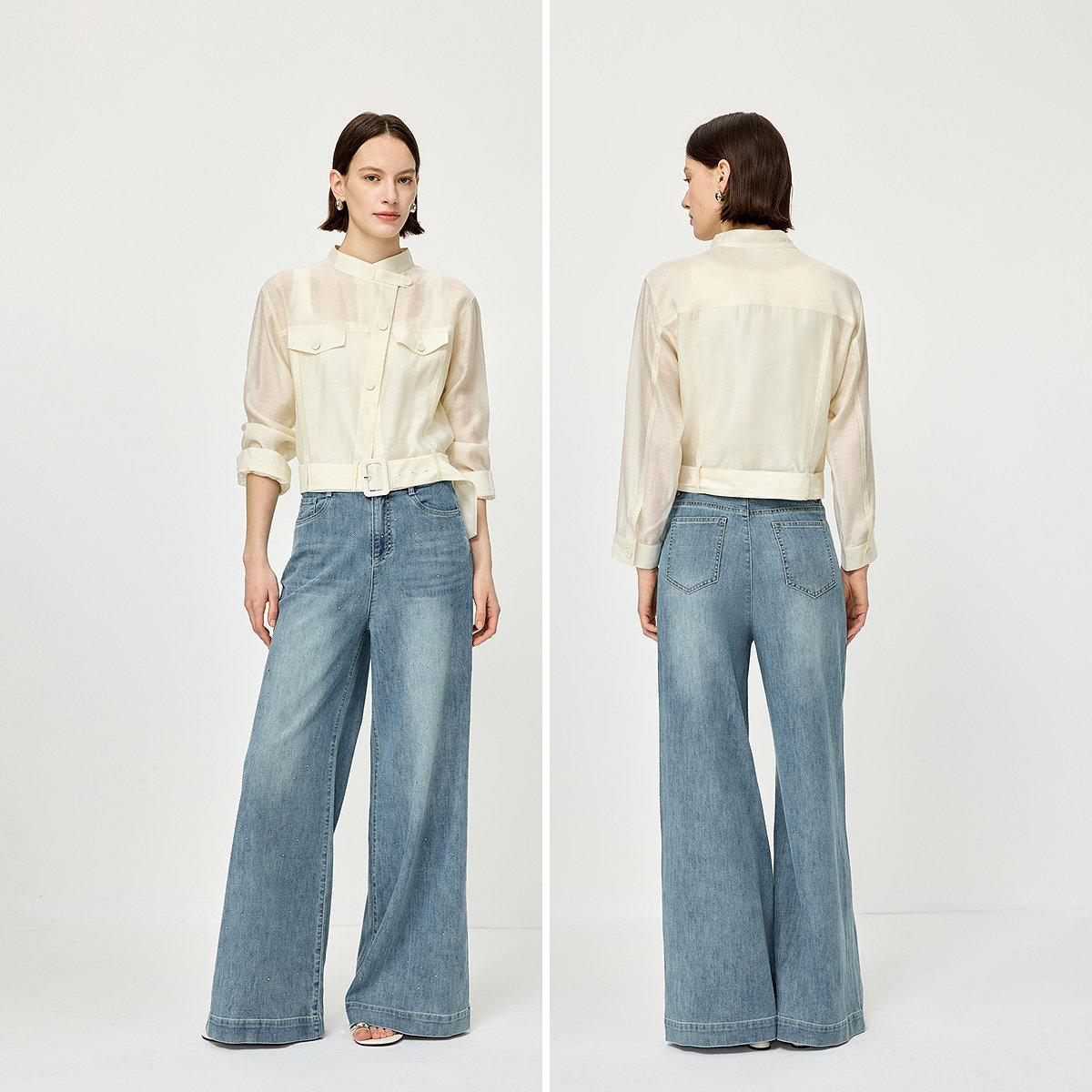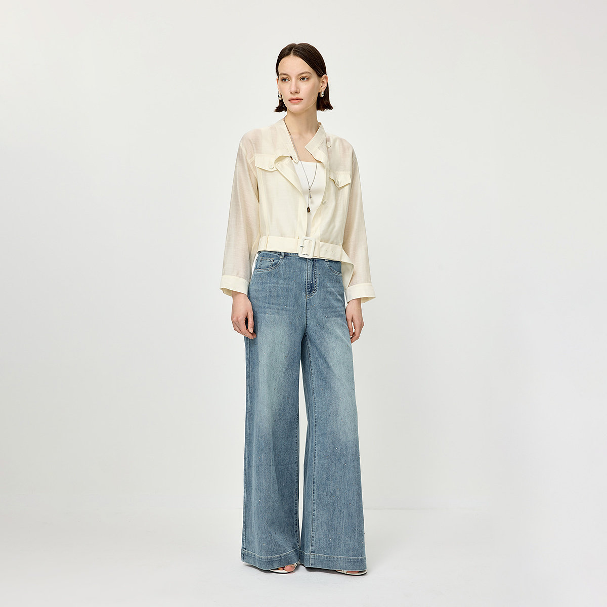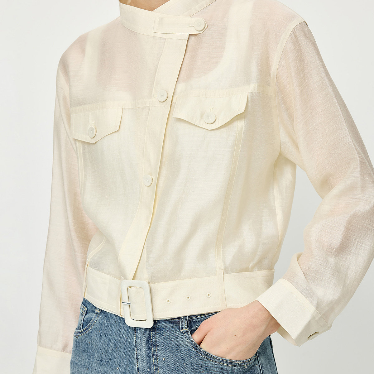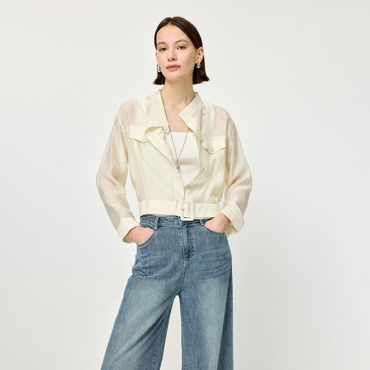 LILY2026夏新款莱赛尔醋酸混纺含亚麻微光感小立领长袖外套女短款