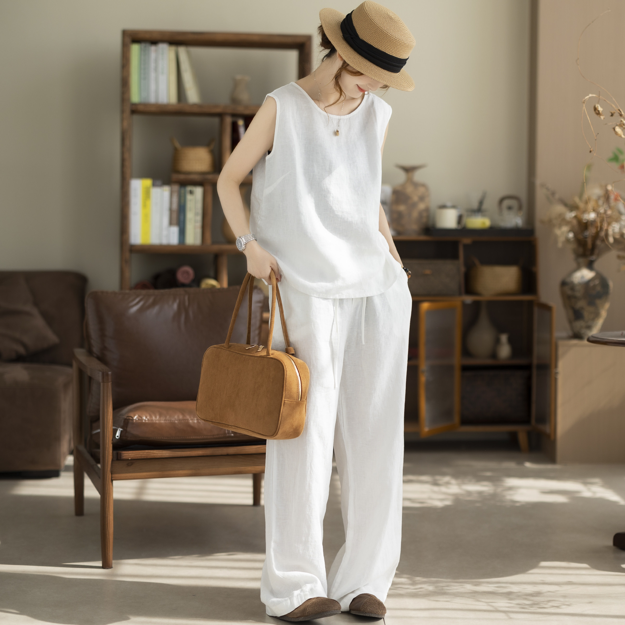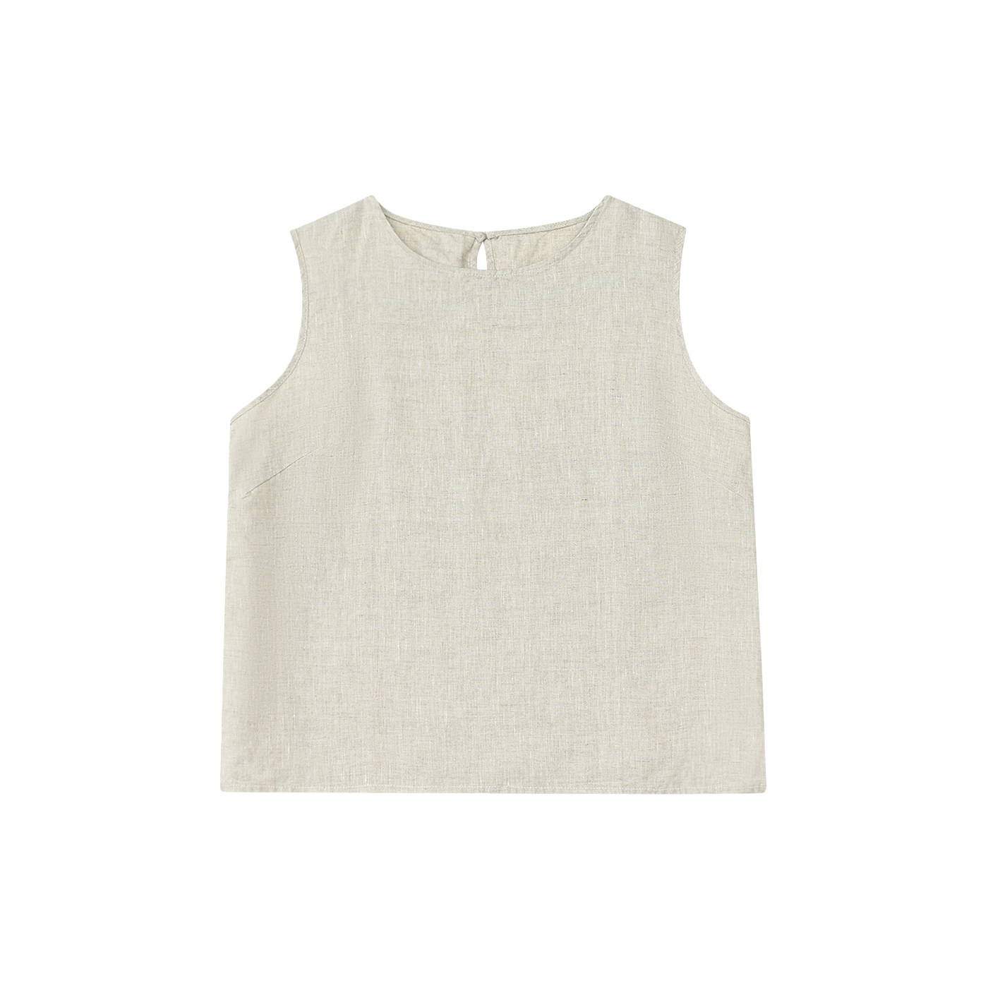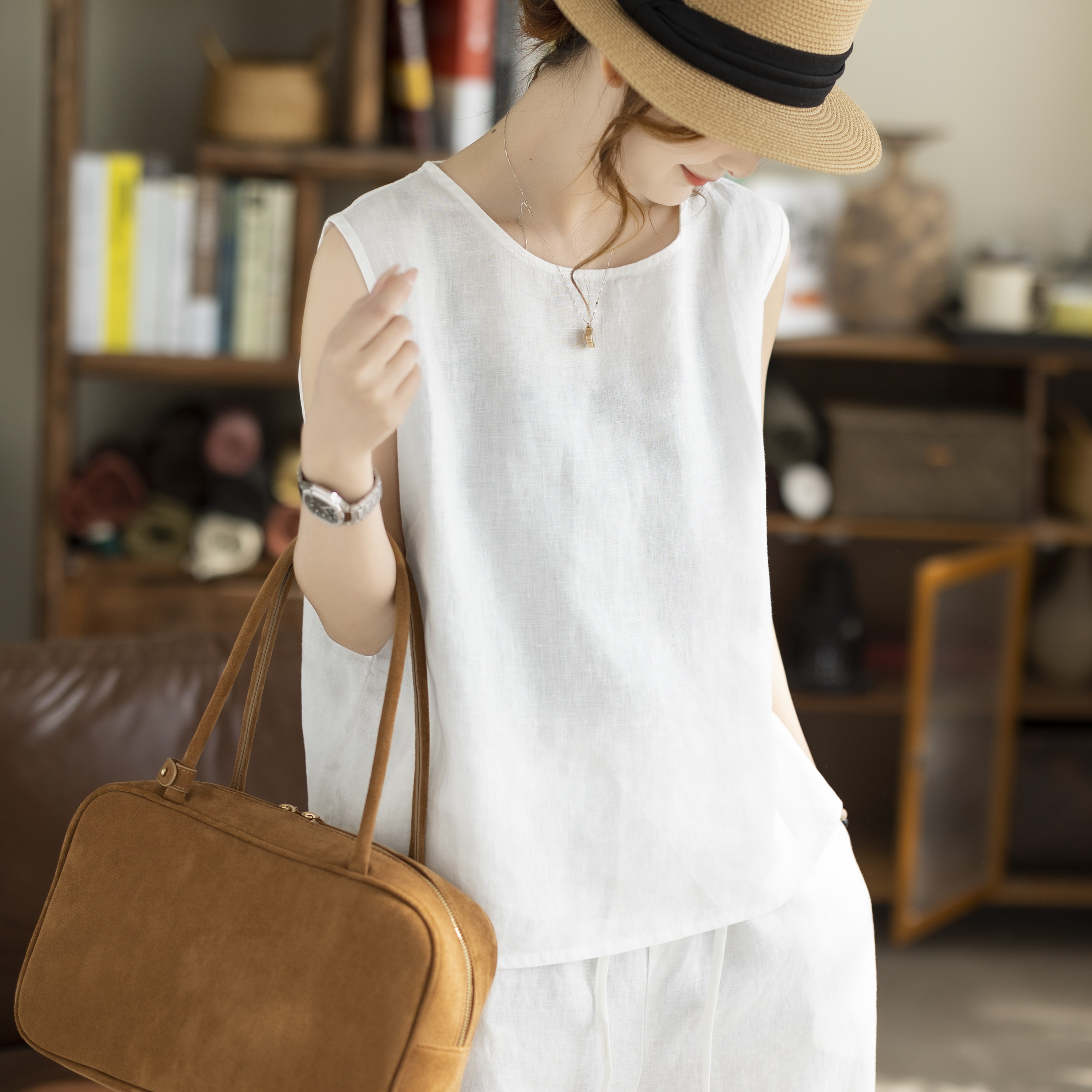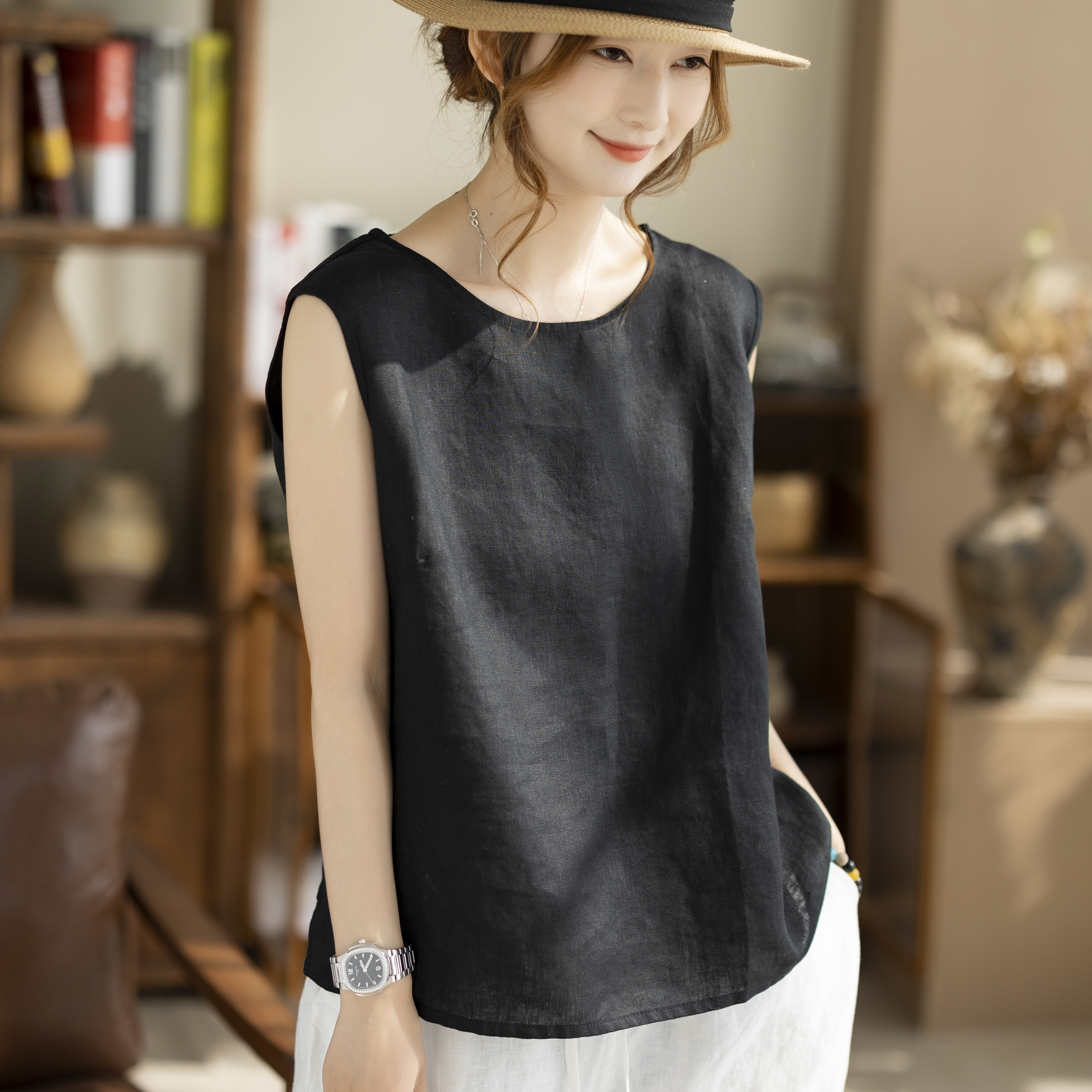 咖咪羽100%亚麻圆领无袖棉麻上衣女宽松透气文艺复古外穿内搭背心