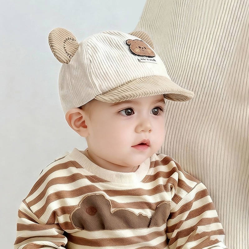 宝宝帽子婴儿鸭舌秋冬季韩版厚男女童可爱小熊防晒灯芯绒春秋软檐