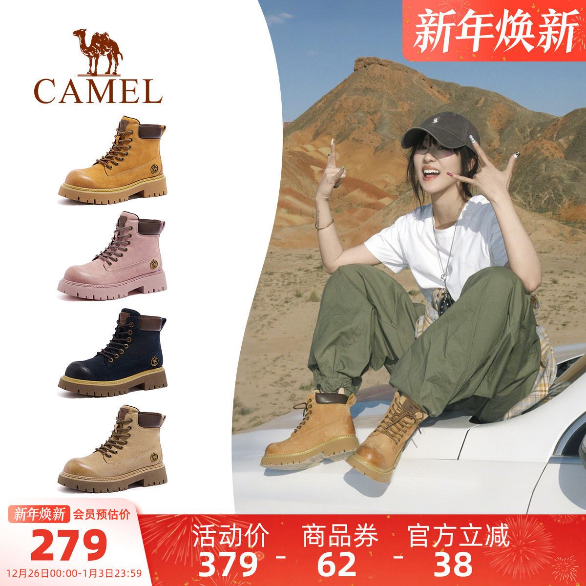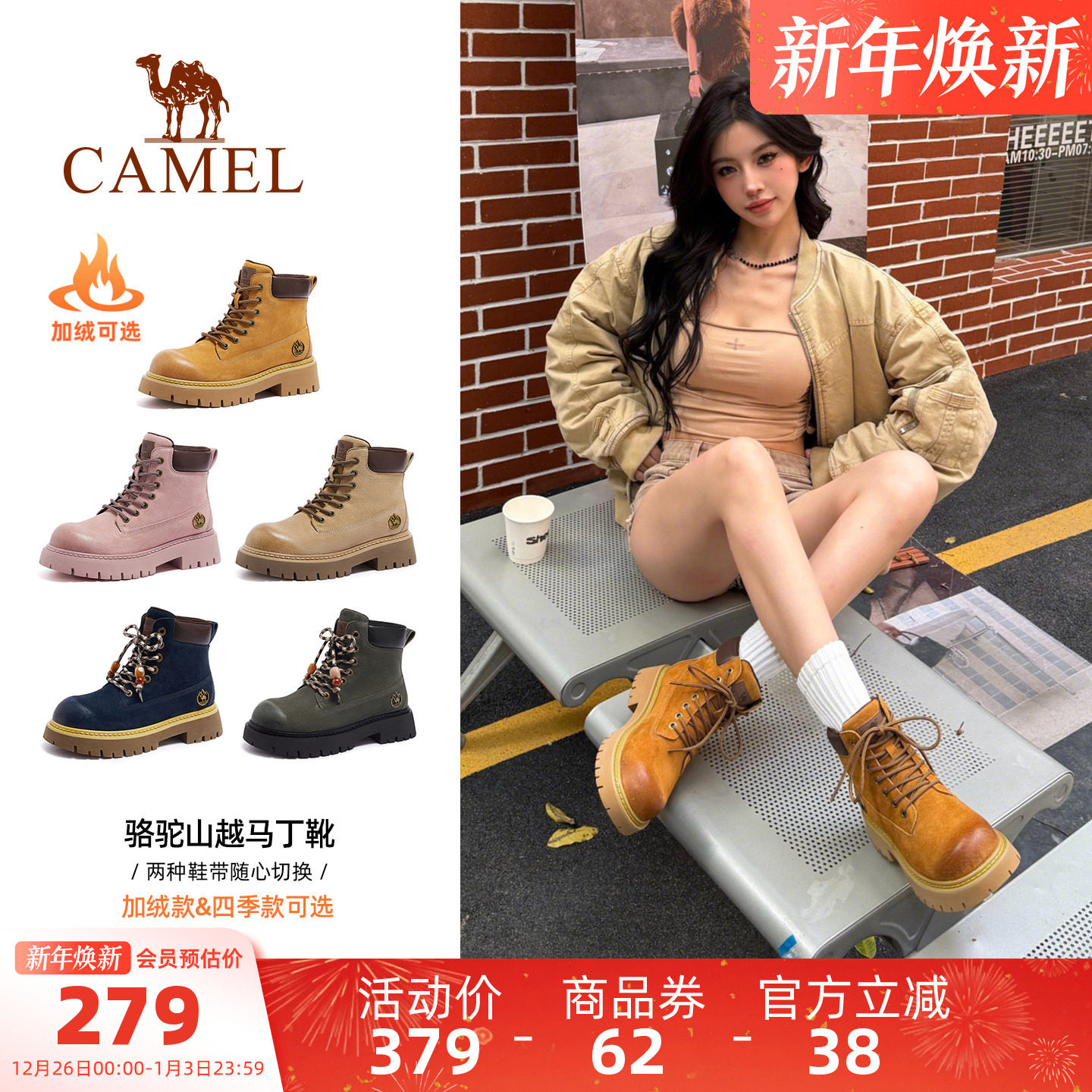 【迪丽热巴同款】骆驼山越马丁靴女鞋2025秋季新款户外工装大黄靴