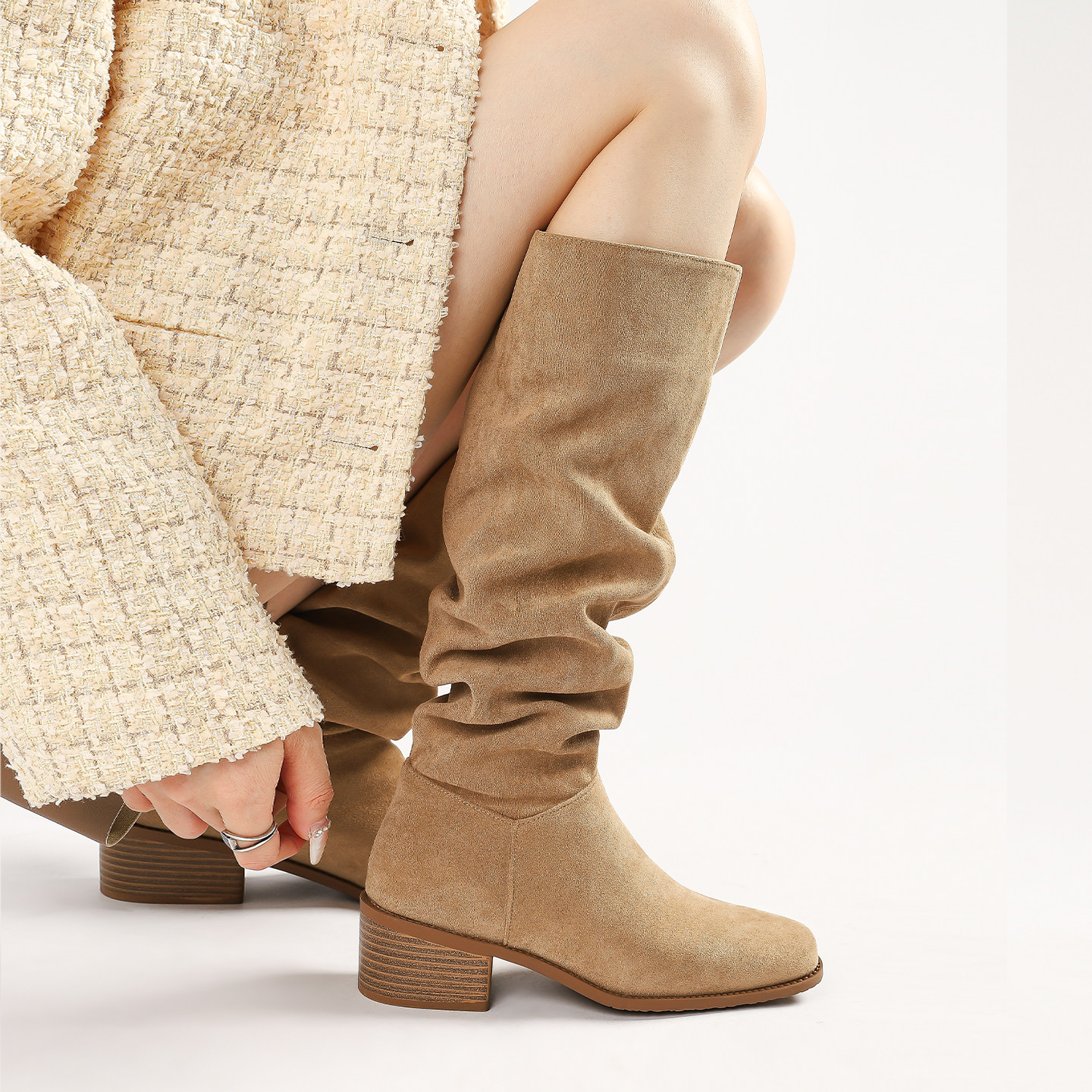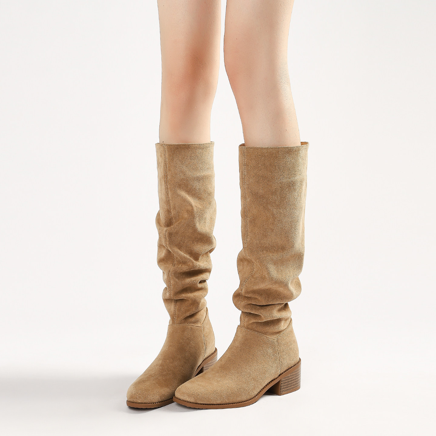 真皮~内增高粗跟骑士靴女秋冬西部靴高筒复古显瘦褶皱堆堆靴长靴