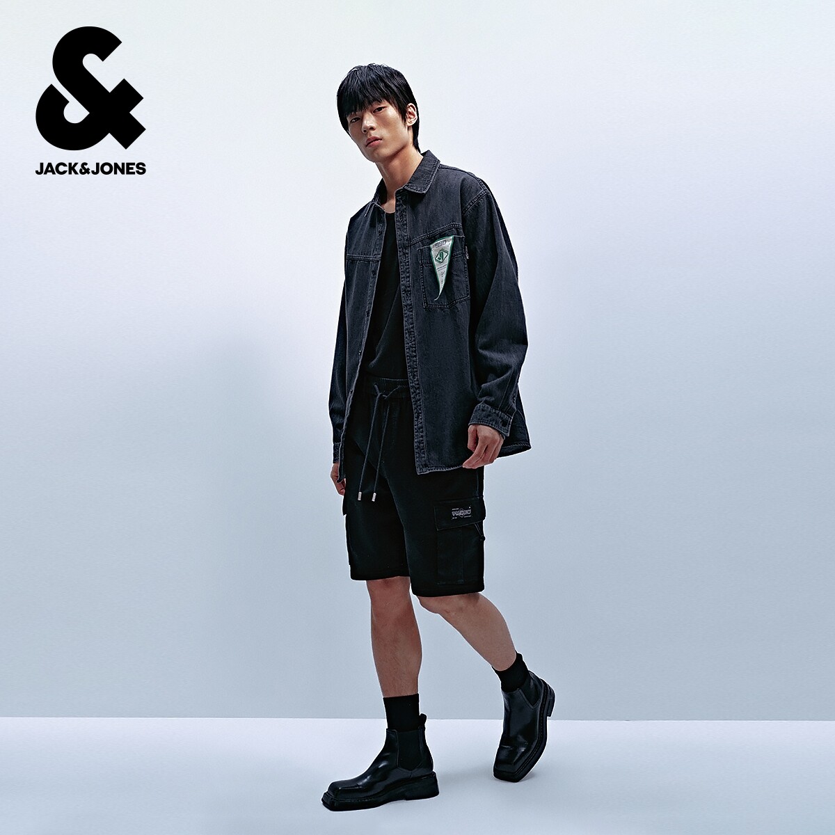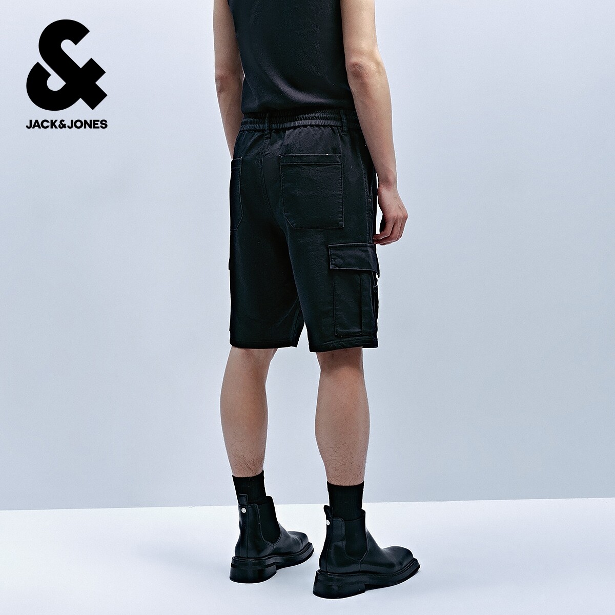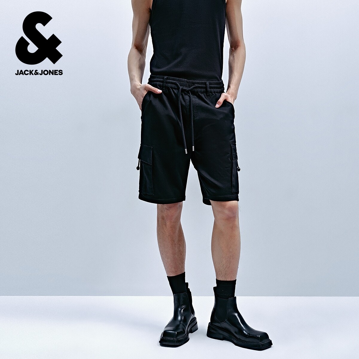 杰克琼斯男装奥特莱斯夏季新款潮工装风舒适黑色直筒牛仔短裤子
