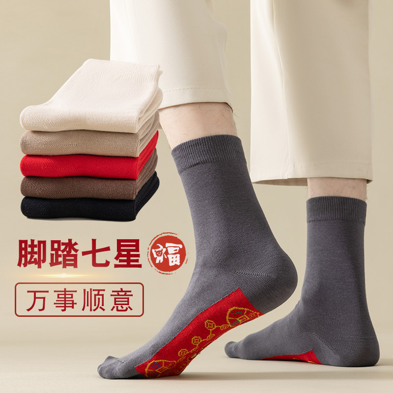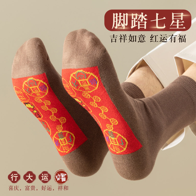 猫人七星连珠纯棉红袜子走鸿运袜男女属蛇年本命年新年喜庆中筒袜