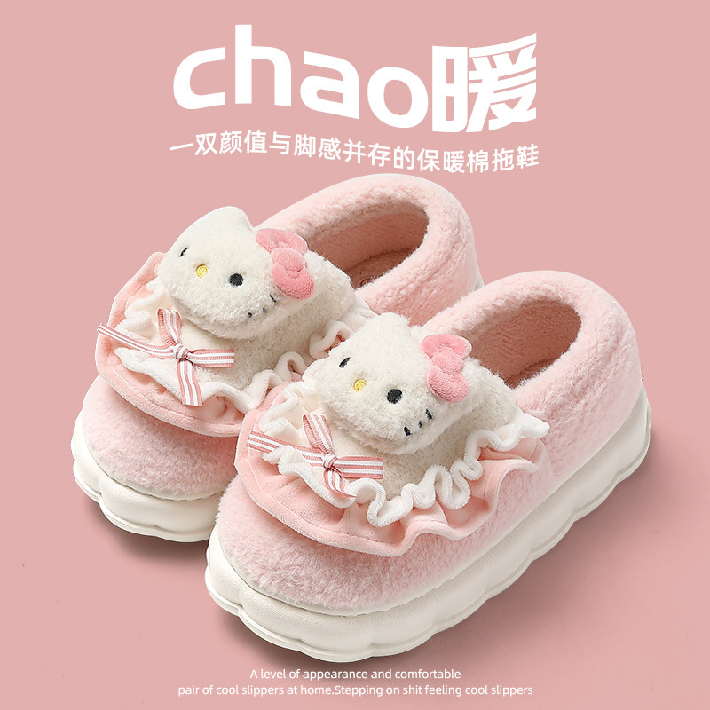 HelloKitty棉拖鞋女士冬季2025新款室内家居毛绒保暖包跟月子鞋女