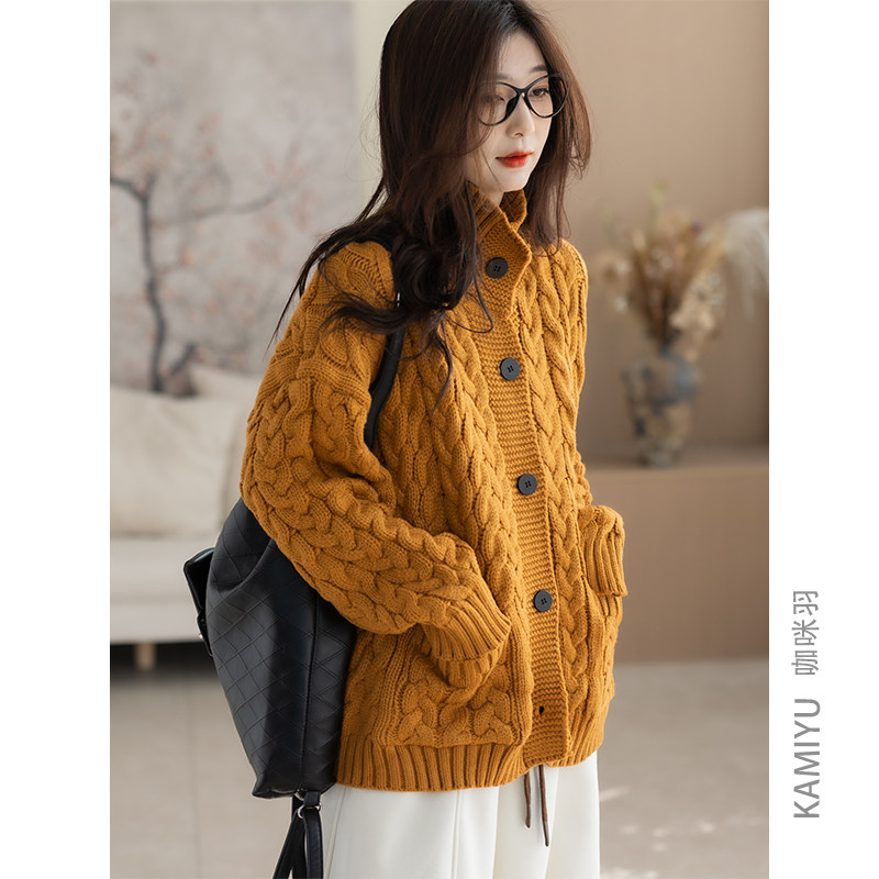 加厚版!慵懒风撞色单排扣毛衣开衫女冬季新款韩版宽松针织外套潮