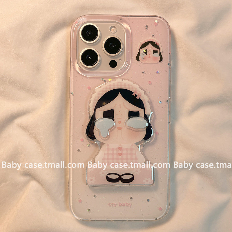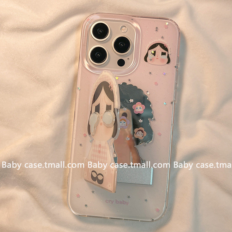 卡通可爱哭娃翻盖镜面支架适用苹果16pro手机壳iphone15新款17promax闪粉15pro日韩14pm创意13少女14全包个性