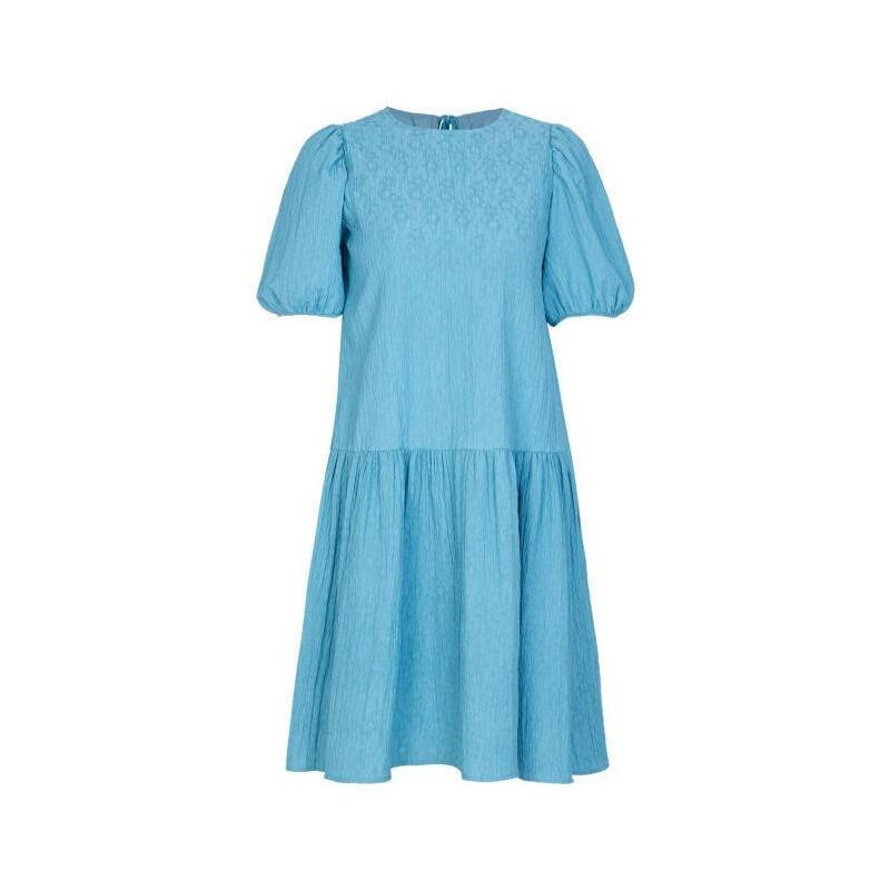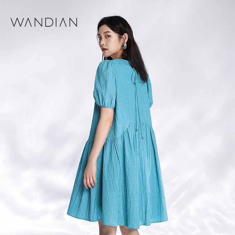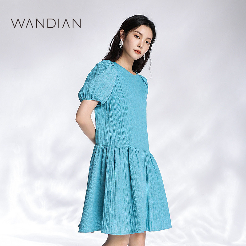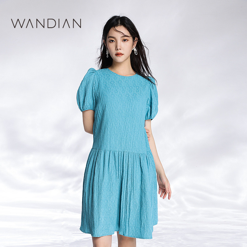 婉甸宝石蓝浮雕工艺泡泡袖连衣裙夏季新品