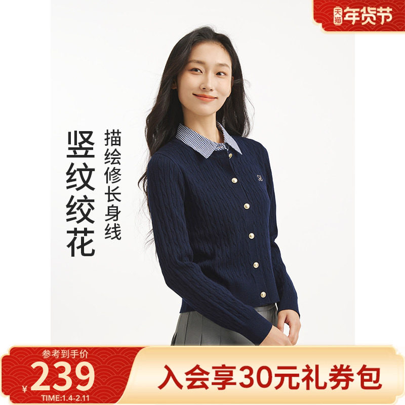 热风针织开衫2025年秋季新款女士修身假两件POLO领细密绞花针织衫