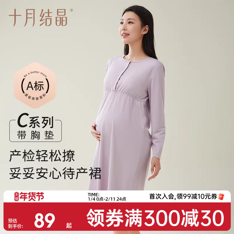 十月结晶孕妇睡裙胸垫纯棉月子哺乳待产连衣裙长袖吊带背心春秋季