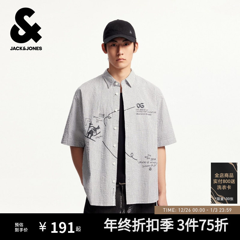 杰克琼斯男装秋季新款通勤风休闲条纹字母刺绣宽松翻领短袖衬衫