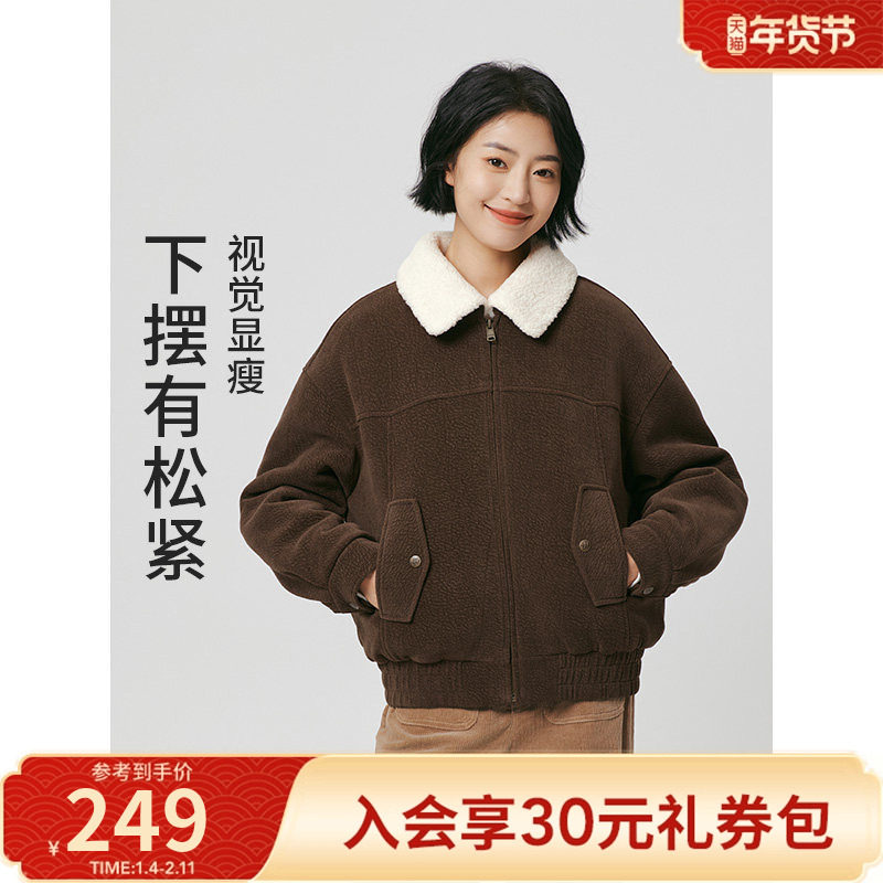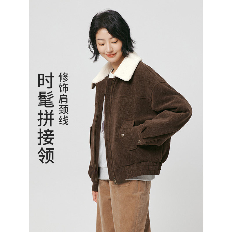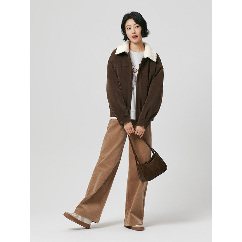 热风女士灯芯绒外套2025年冬季新款宽松保暖拼色翻领绒感短外套
