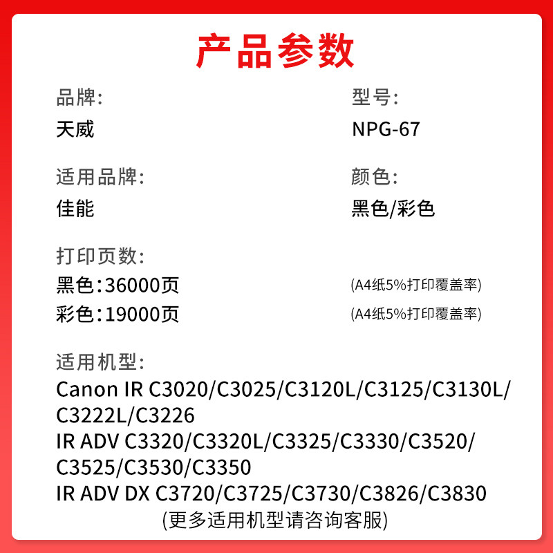 天威适用佳能NPG-67粉盒C3020粉盒 C3120L C3025 C3325 C3350 C3525 C3330墨盒 C3320 C3320L C3125 碳粉