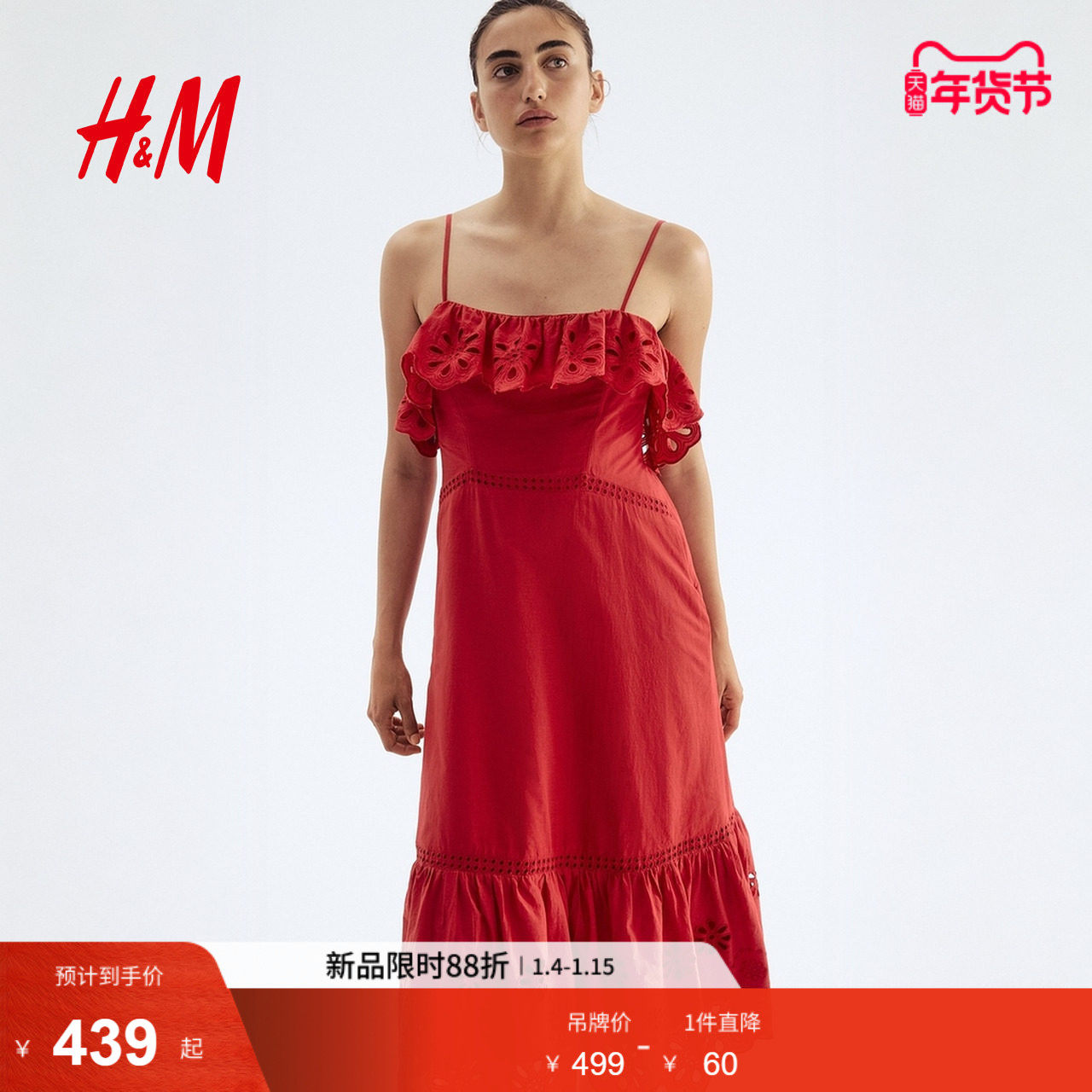 HM女装连衣裙春季镂空刺绣棉质印花吊带连身裙1282051