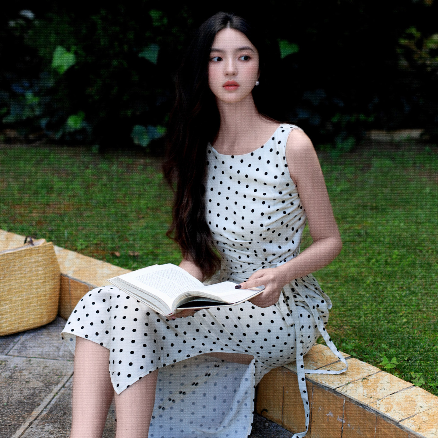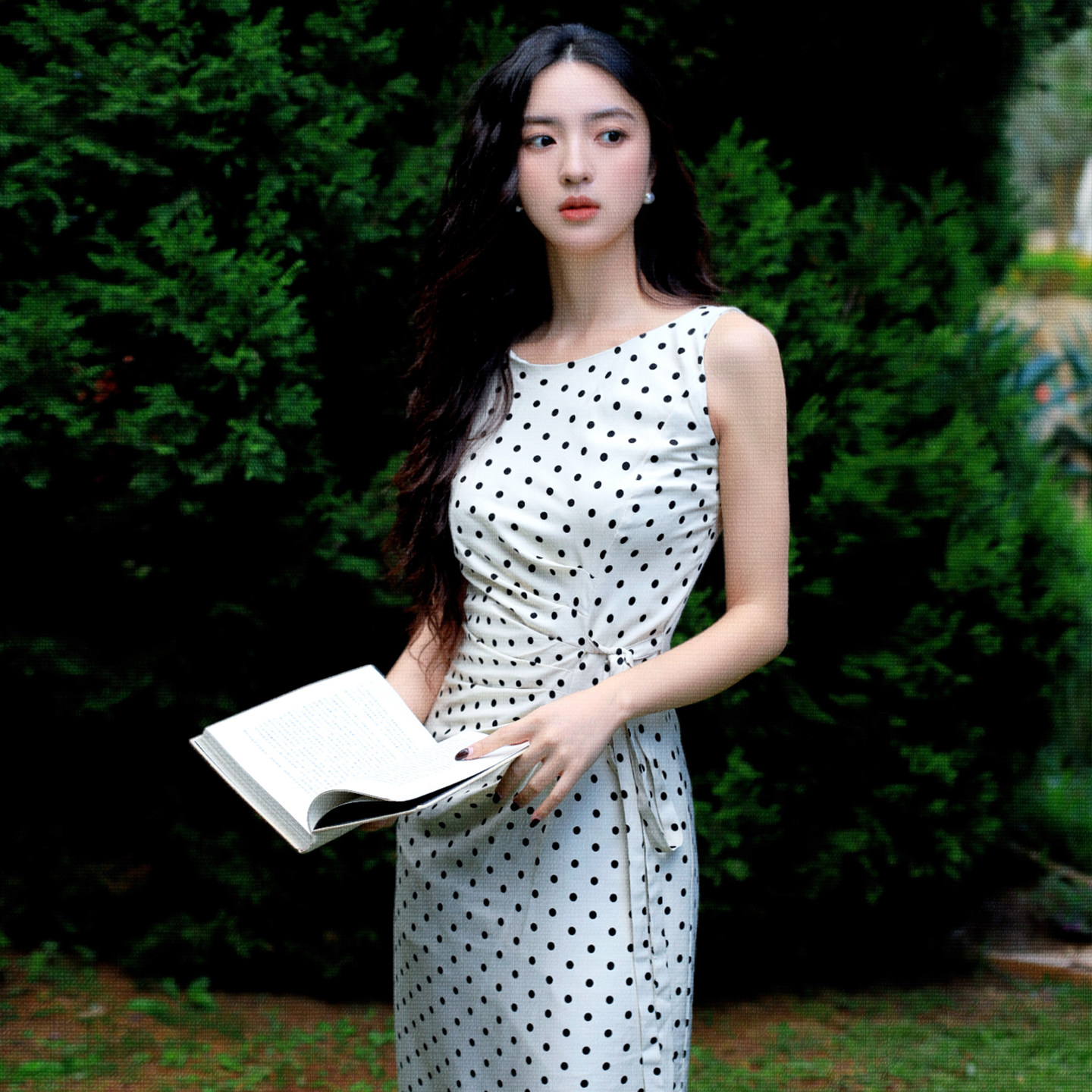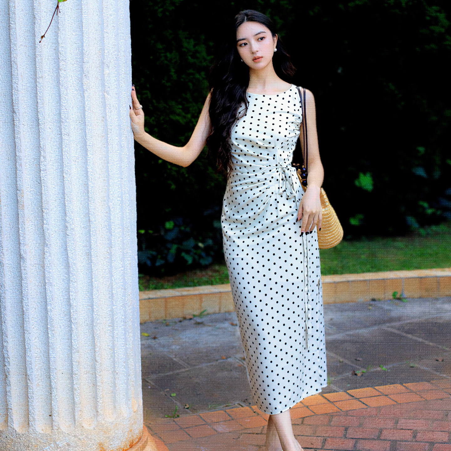 JUJU定制高级感气质波点连衣裙女亚麻棉法式收腰长裙无袖裙子夏季
