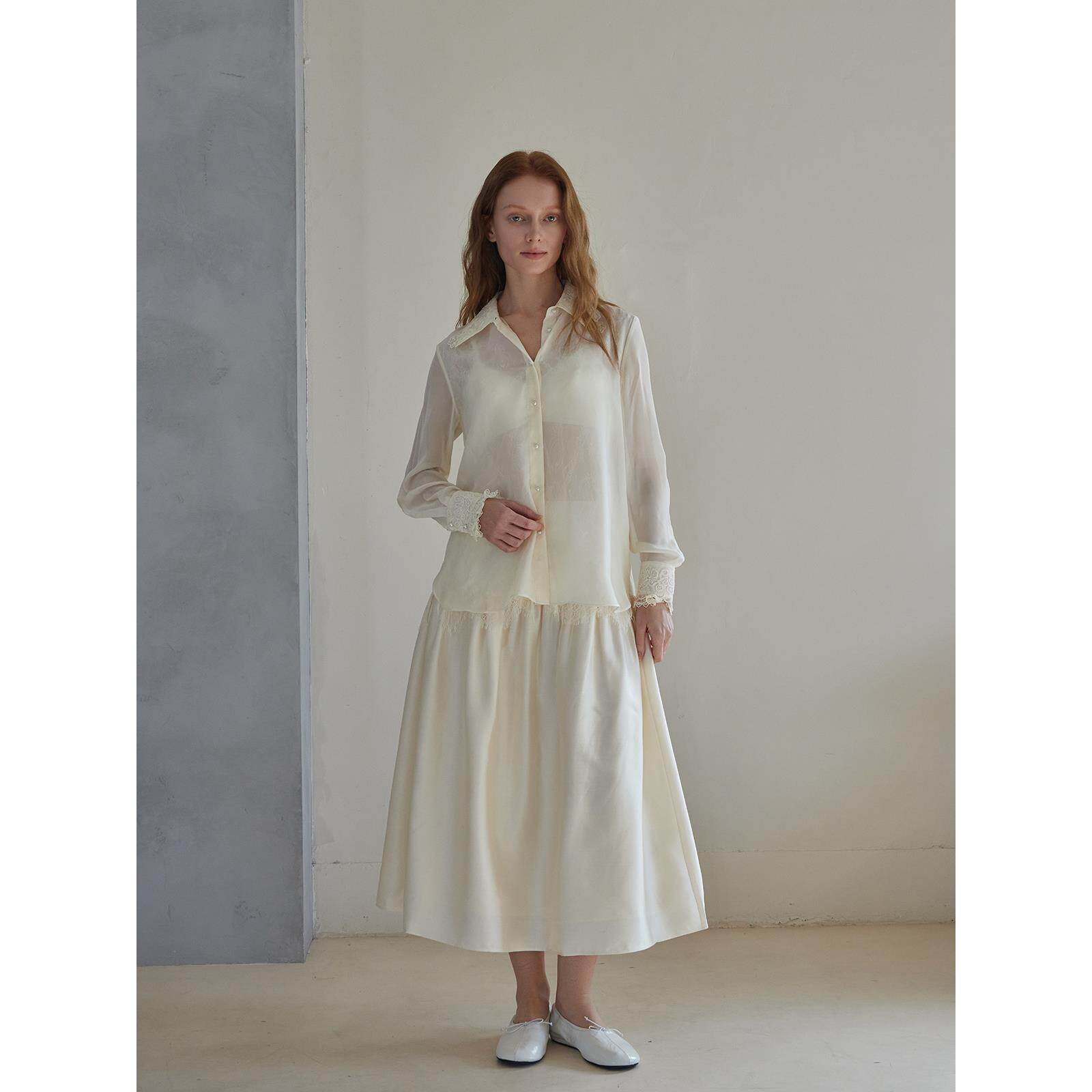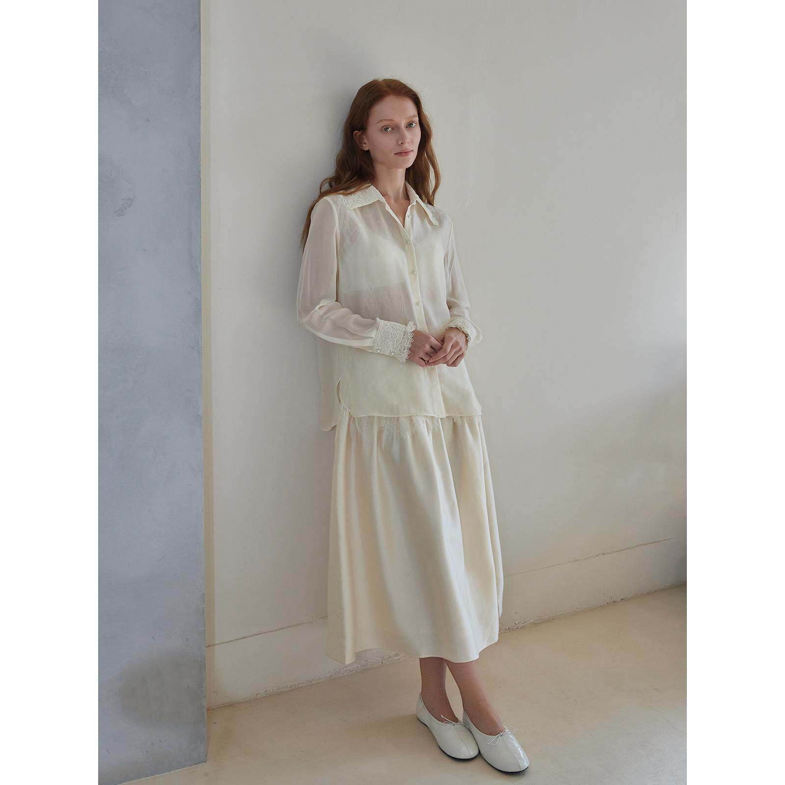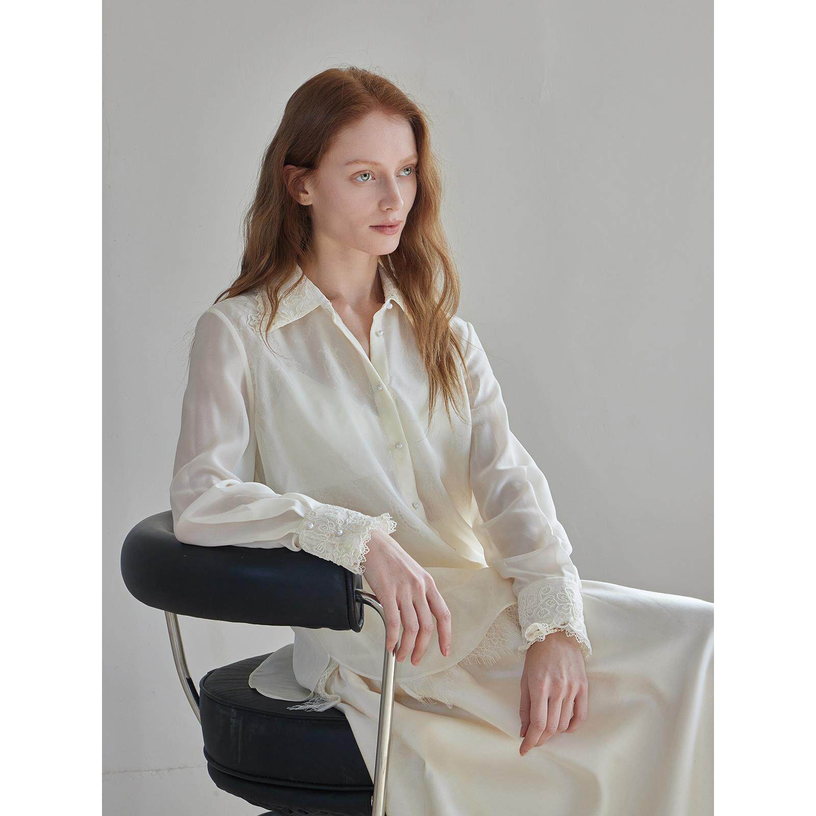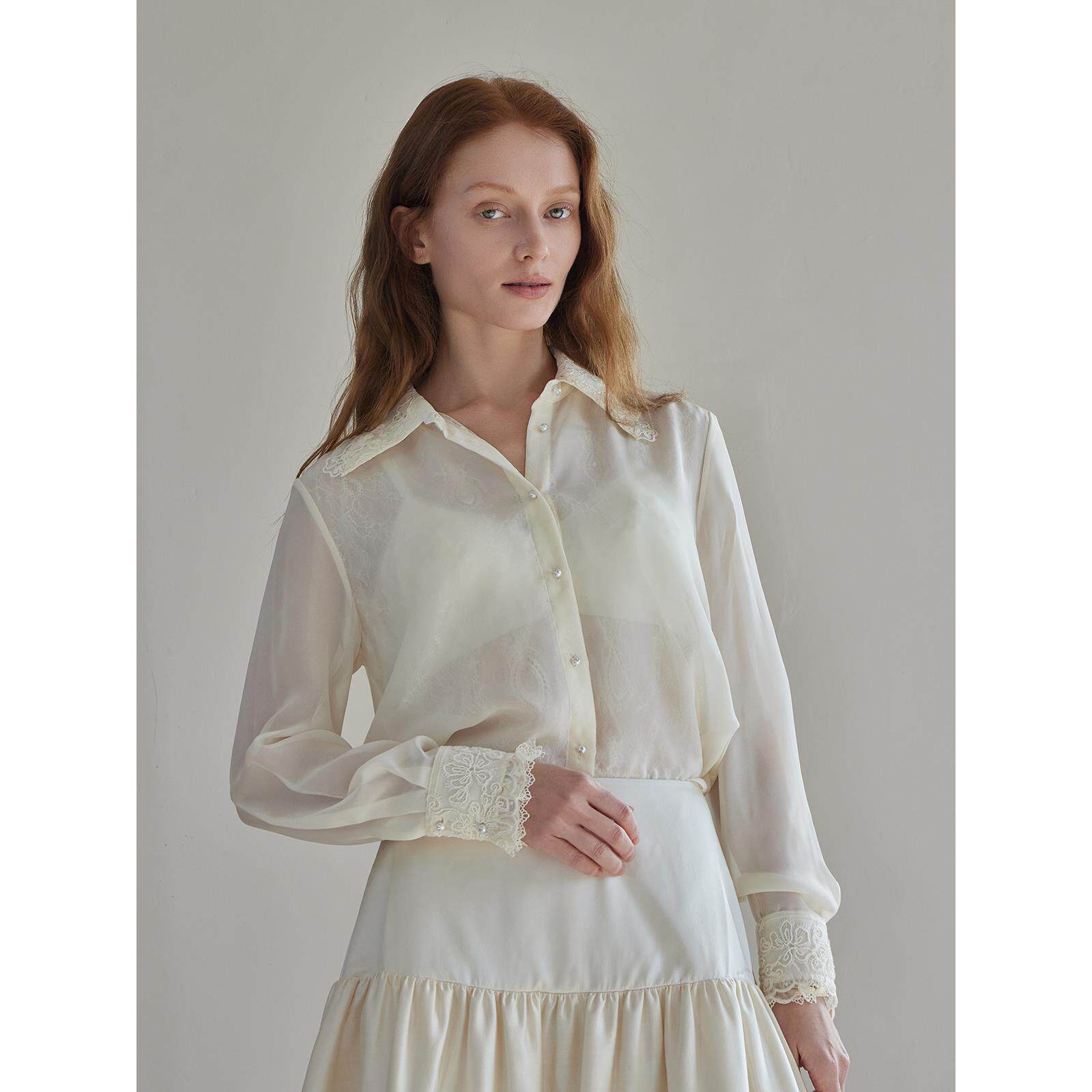 THEEASE舒适派桑蚕丝衬衫雪纺纱蕾丝边微透高级感优雅女长袖上衣