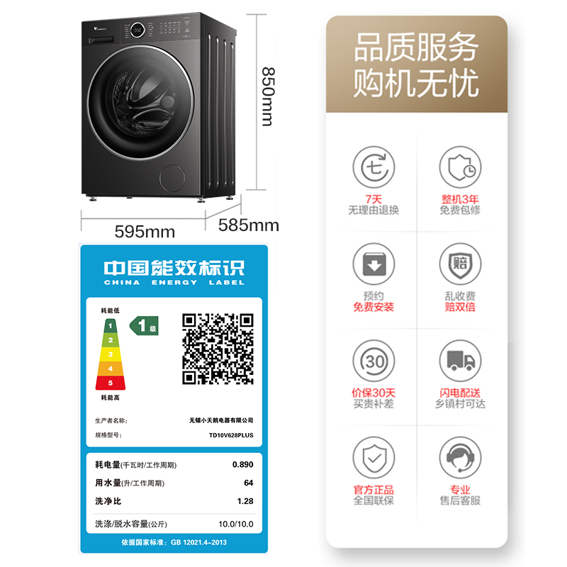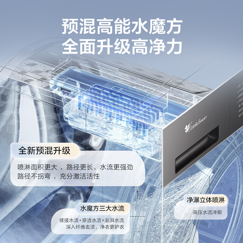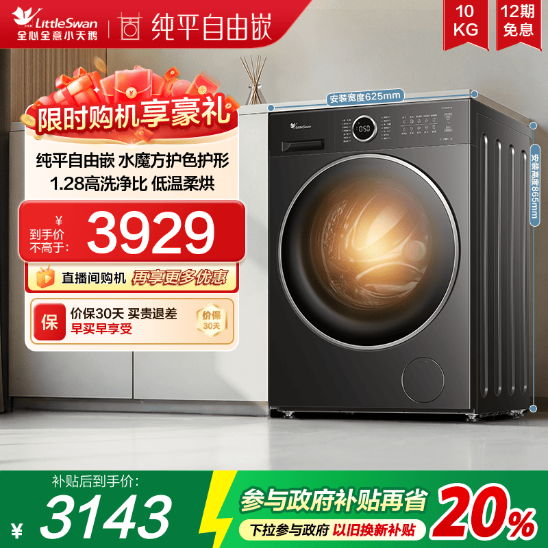 [纯平自由嵌]小天鹅洗衣机10KG大容量水魔方滚筒洗烘一体628PLUS