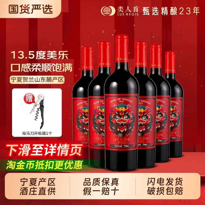 类人首 宁夏红酒贺兰山东麓龙腾美乐橡木桶干红葡萄酒750ml*6支装