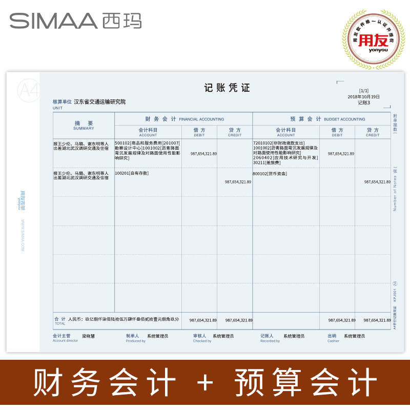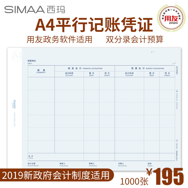 西玛A4平行记账纸 新政府会计制度用友政务软件行政事业版预算会计财务会计双分录凭证 KPJ501 双摘要KPJ601