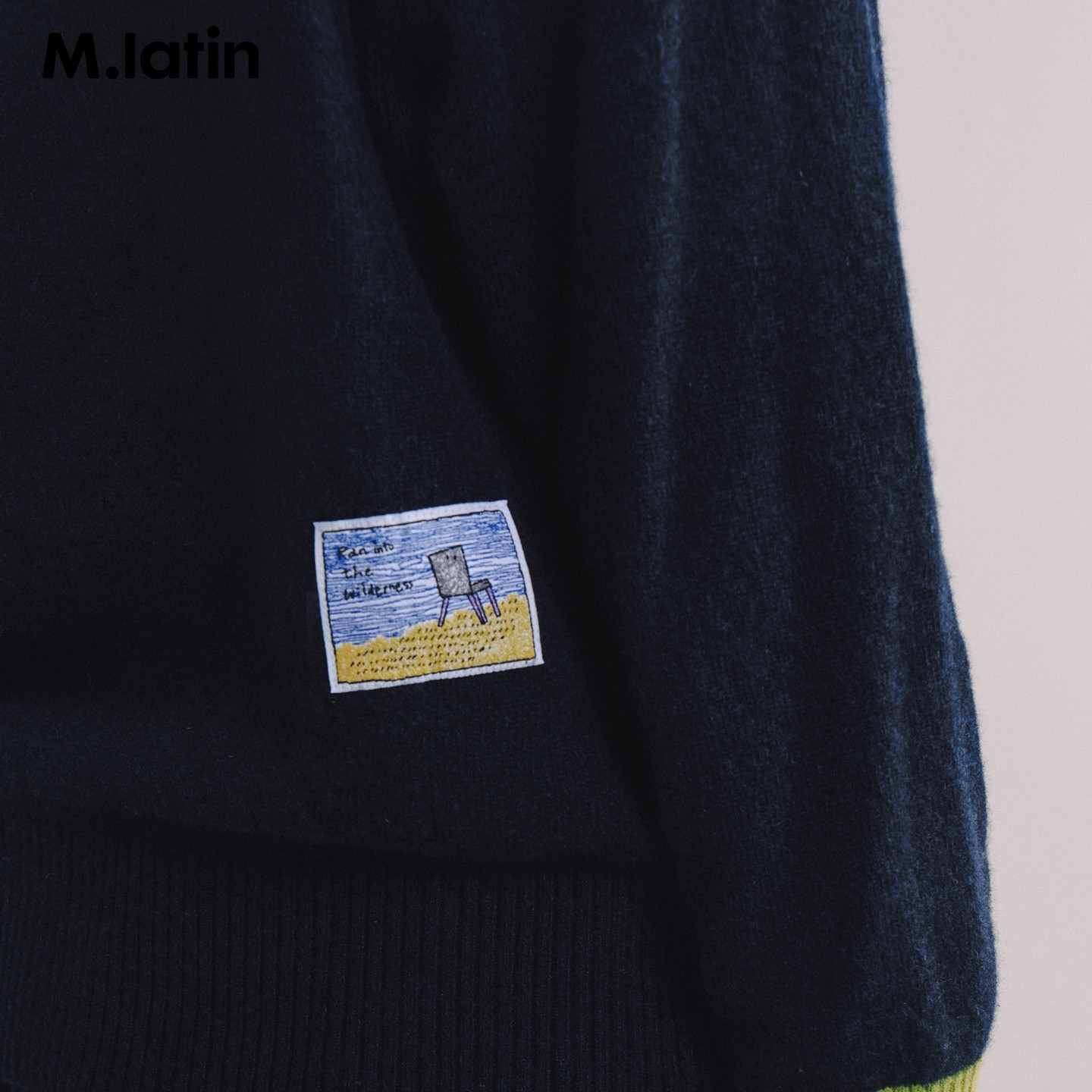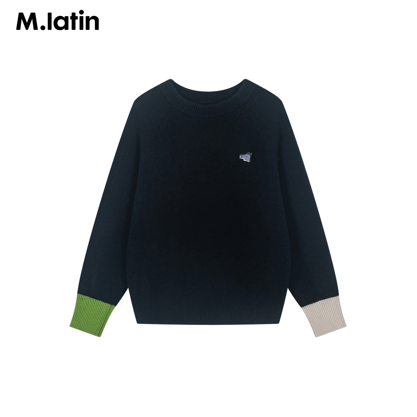 基础百搭圆领毛衣,撞色袖口、趣味绣标设计