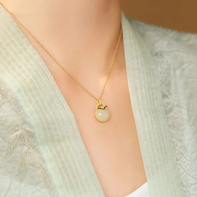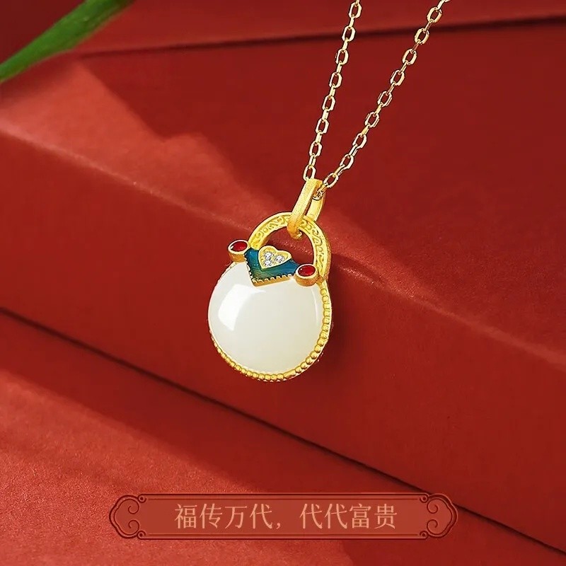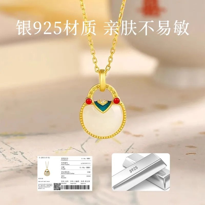 中国黄金央创如意福袋项链纯银女新中式国风锁骨链和田玉吊坠S925