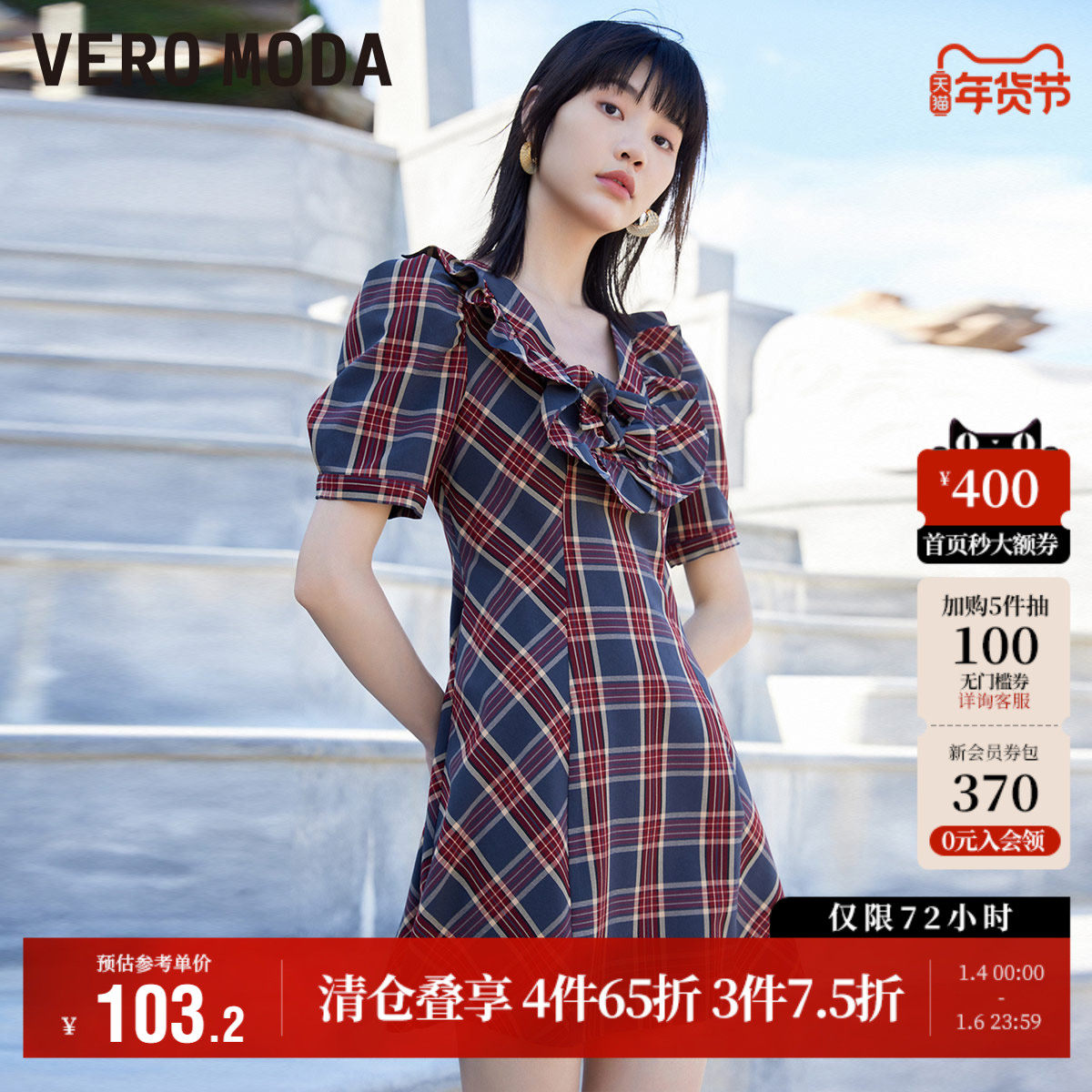 Vero Moda奥莱连衣裙夏季清仓蝴蝶结A摆泡泡袖气质格纹复古裙子