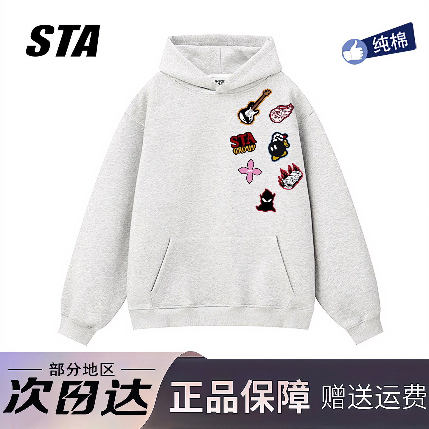 STA旗舰店基础小字母印花连帽卫衣男女美式潮牌重磅纯棉灰色外套
