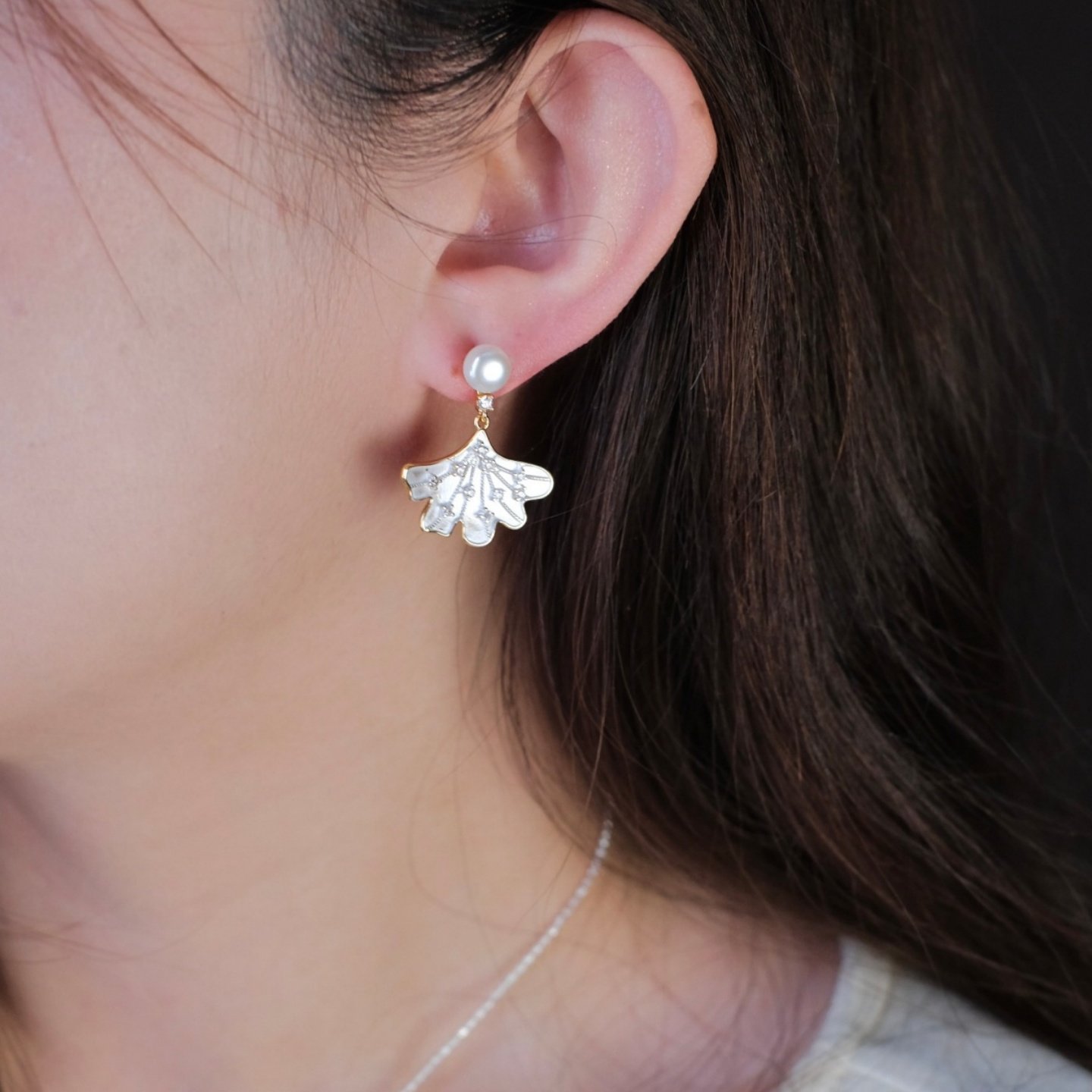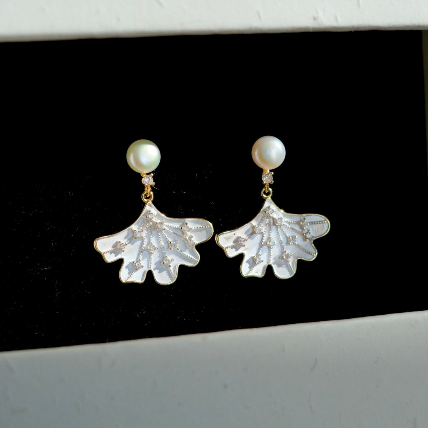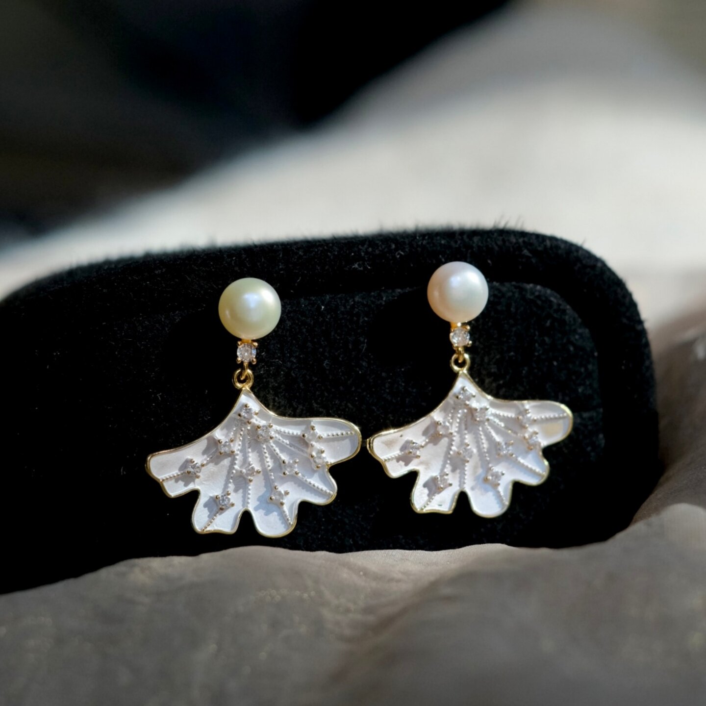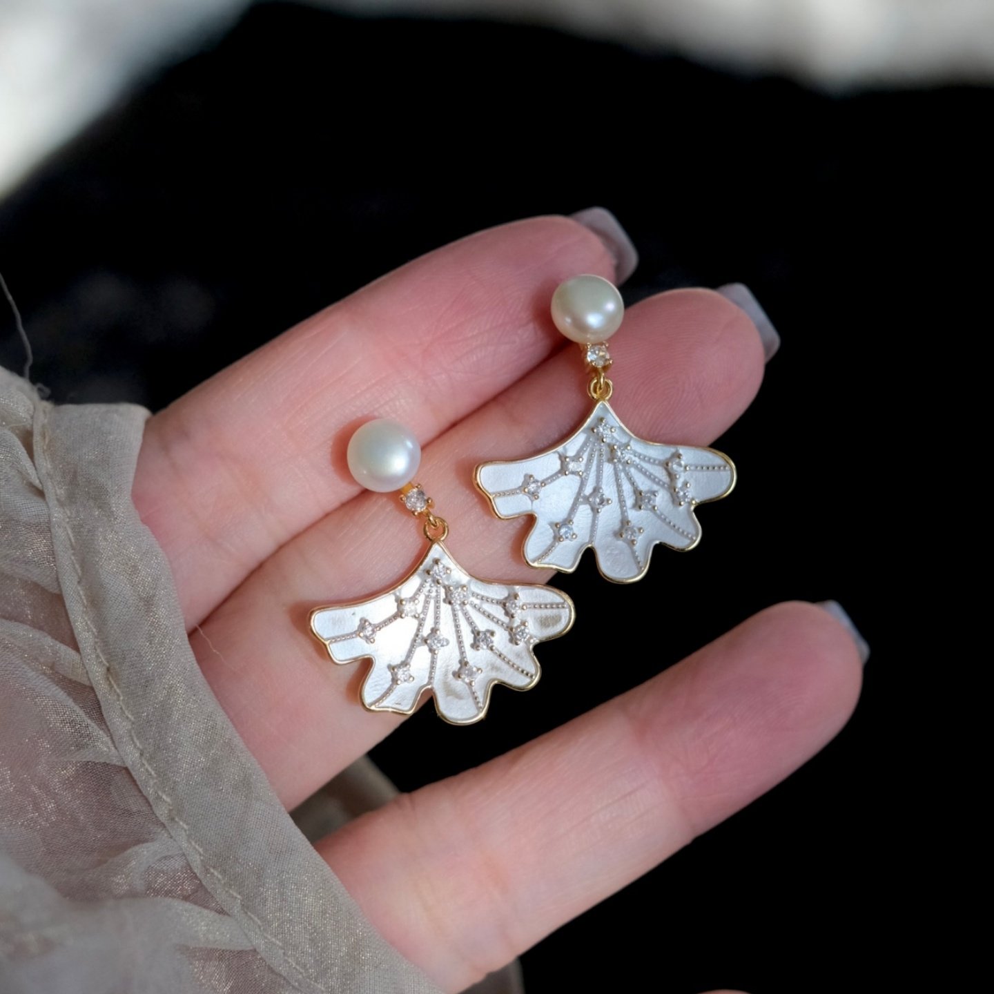《霜花月魄》复古优雅文艺清冷感天然珍珠银杏叶镶钻耳钉耳环耳饰