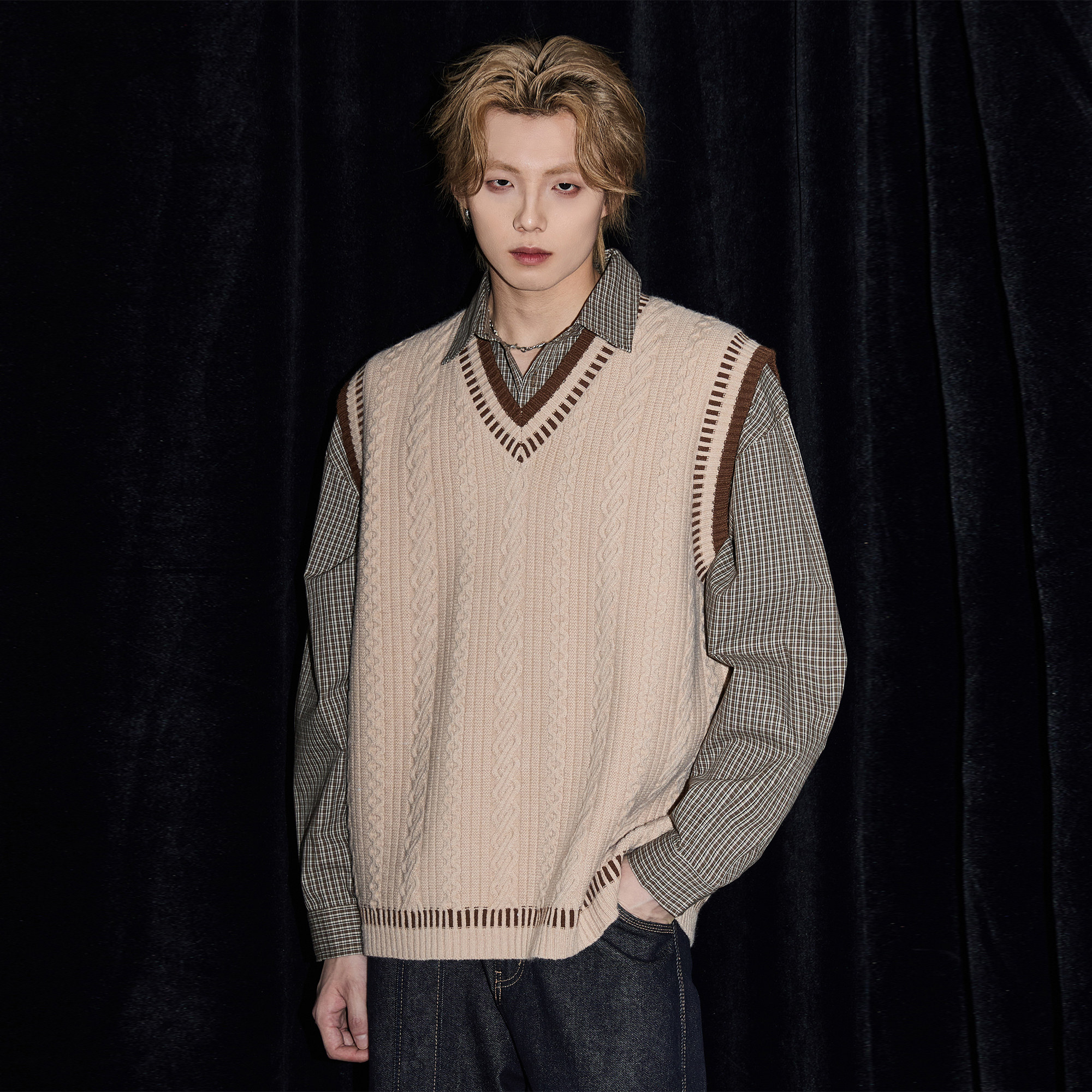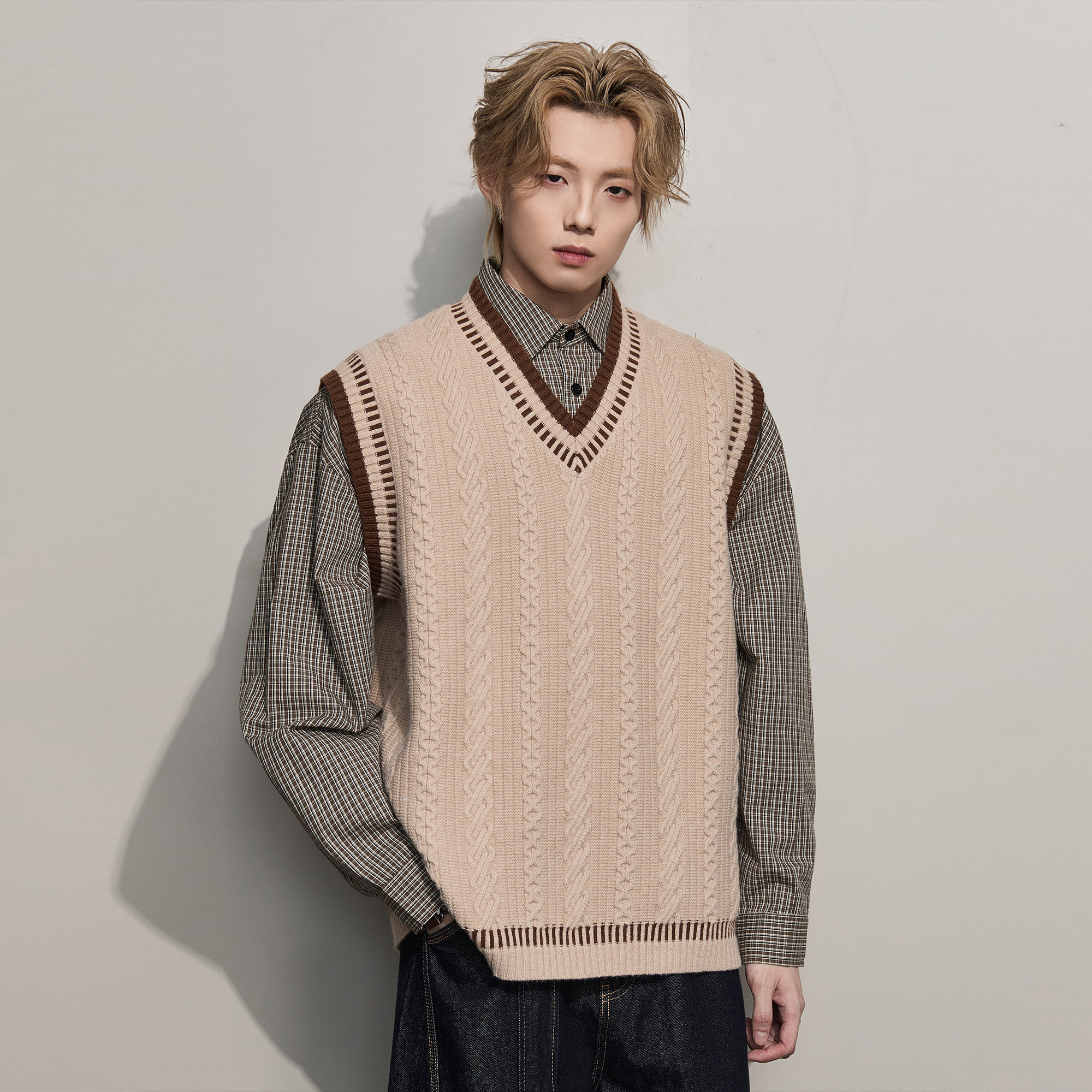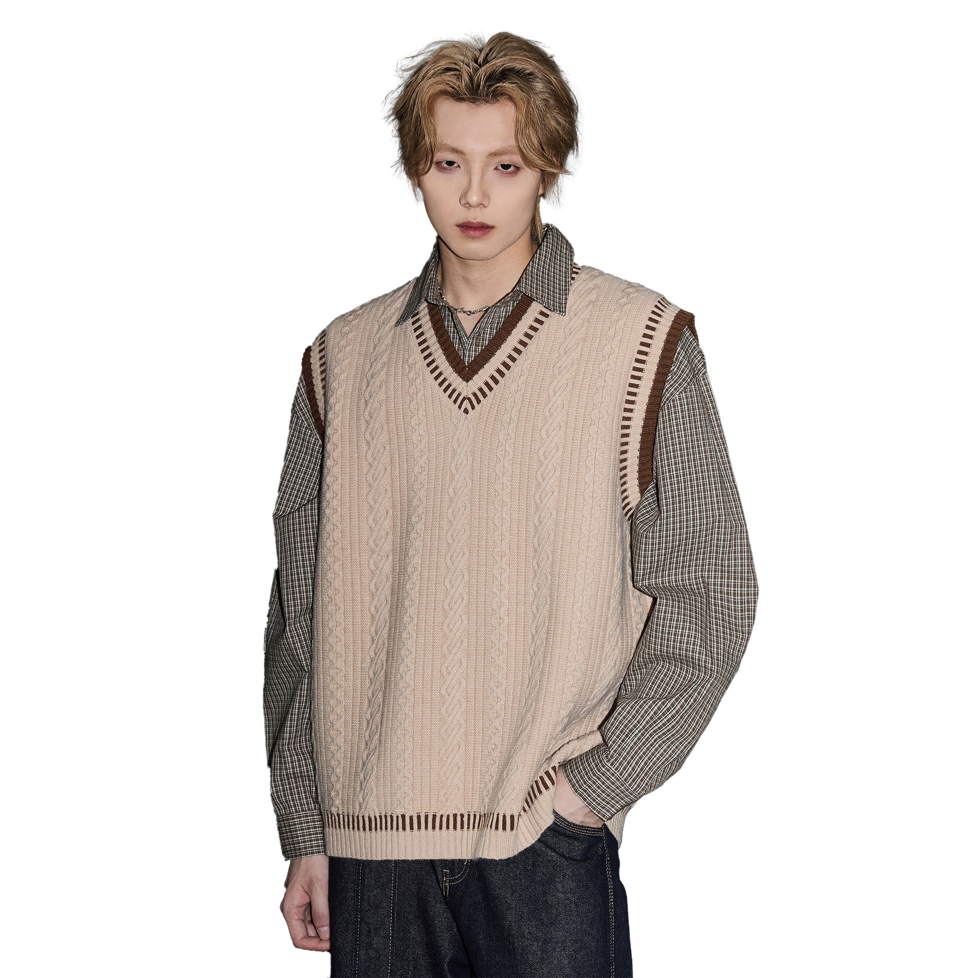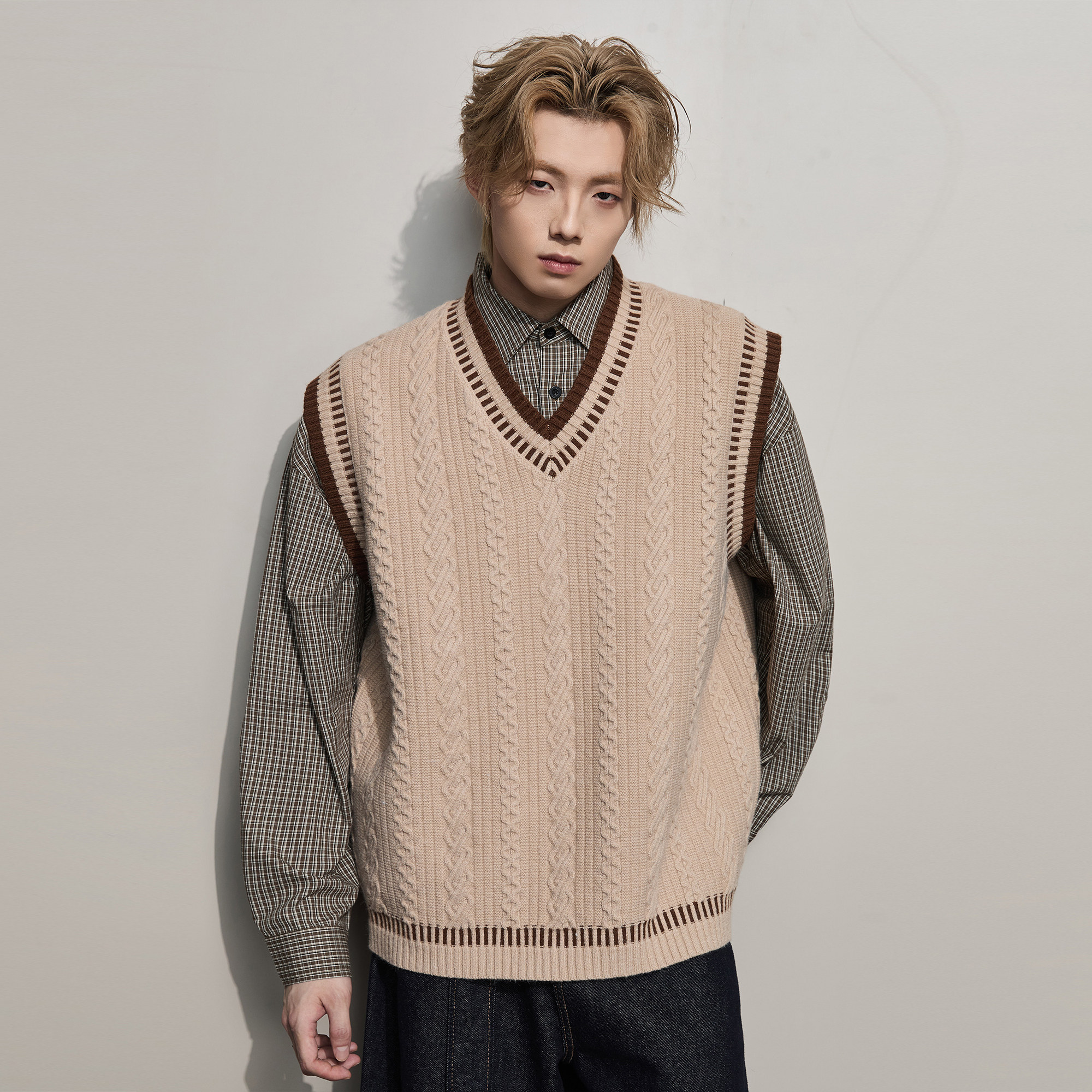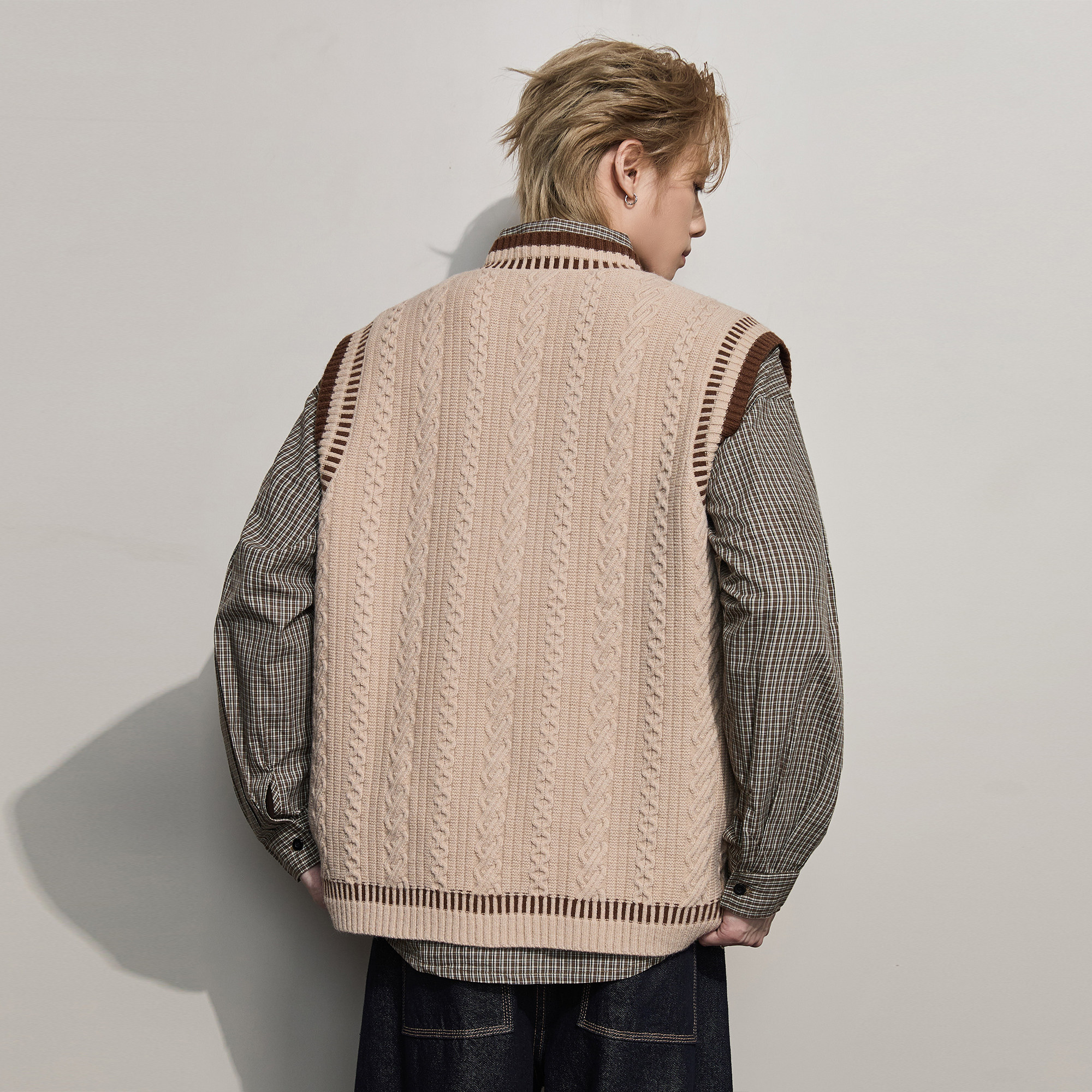 ALLIN 学院风麻花毛衣男秋冬休闲V领背心针织衫情侣宽松坎肩上衣