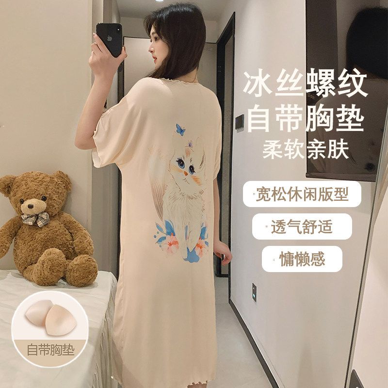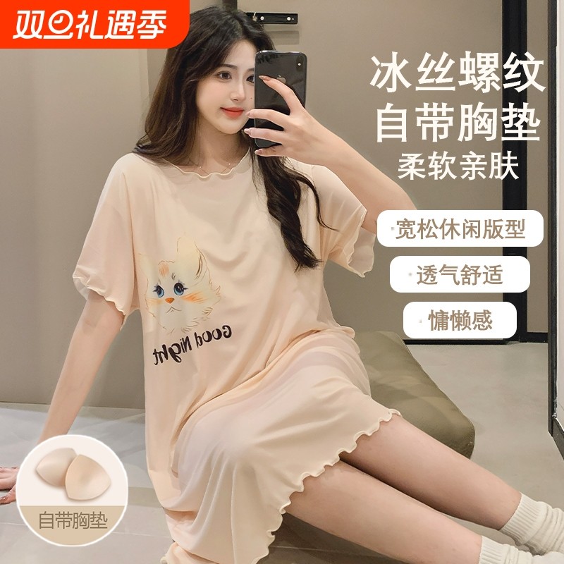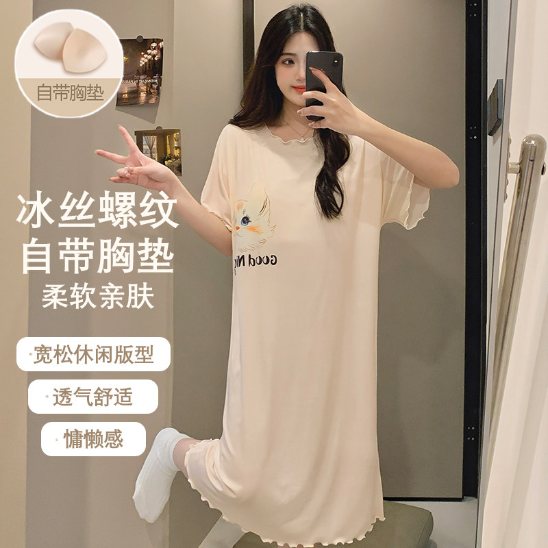 连衣裙女莫代尔短袖睡裙夏薄款打底裙外穿宽松百搭家居服大码长裙