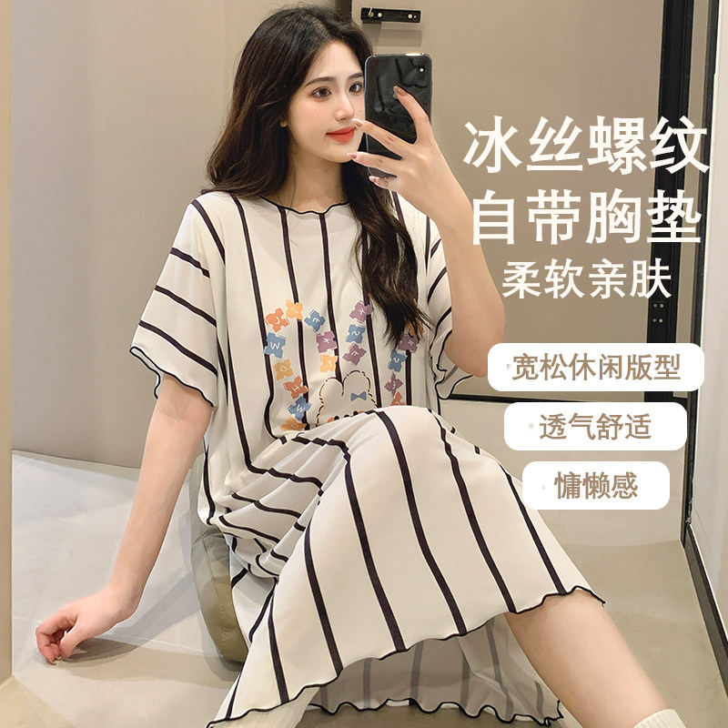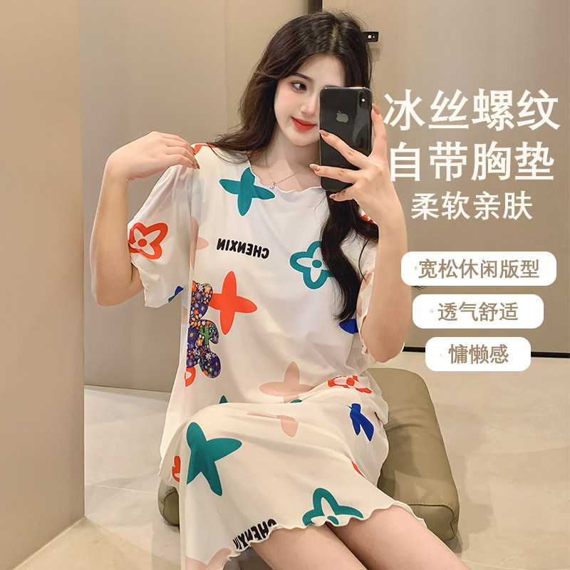 睡衣女夏季冰丝螺纹加大码300斤胖mm薄款短袖卡通家居服睡裙波点