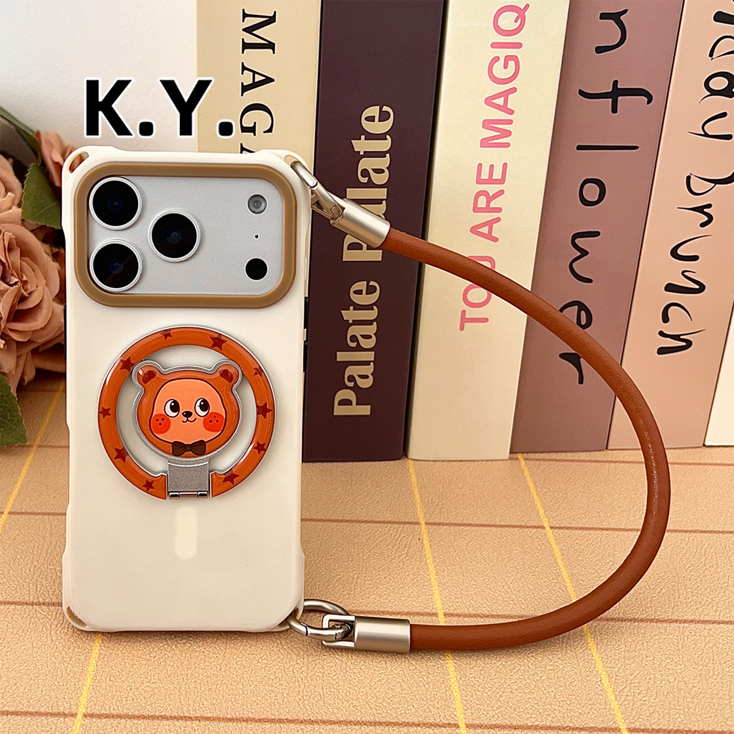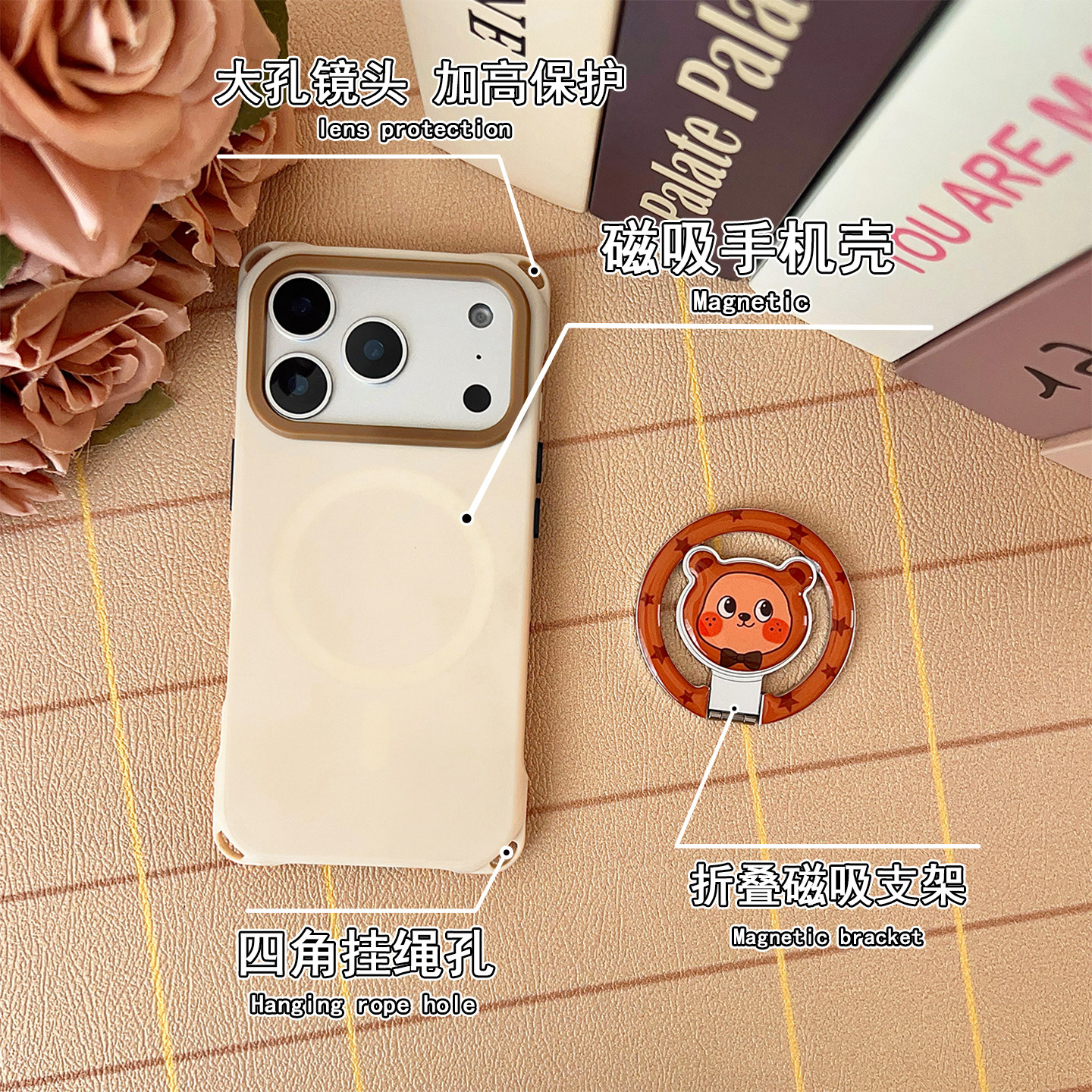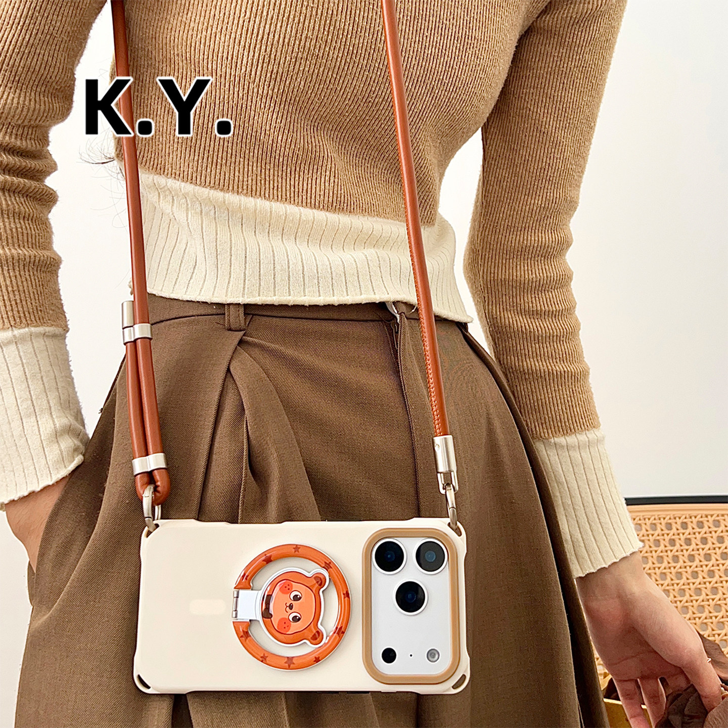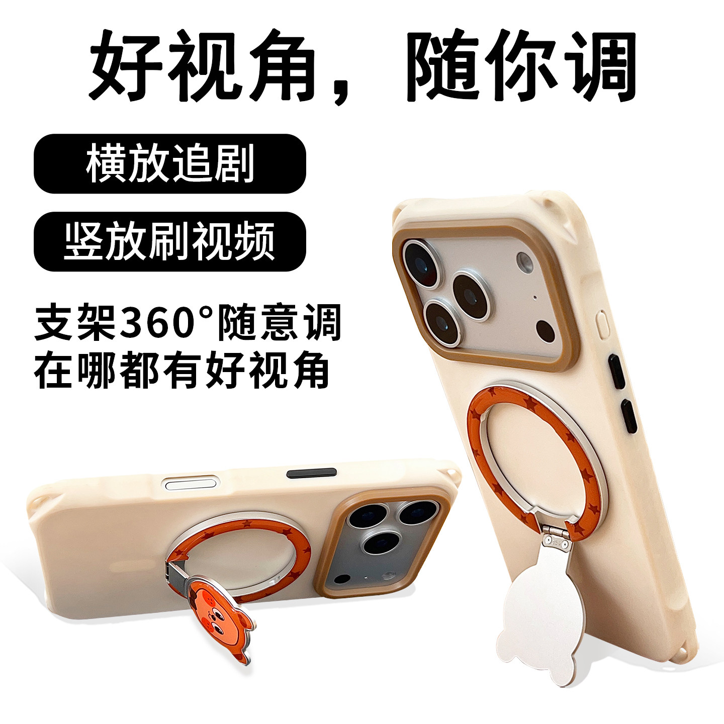 熊猫型领结棕熊磁吸折叠支架手机壳带挂绳可背手提斜跨适用于苹果17Promax华为mate80系列简约风小米防摔硬壳