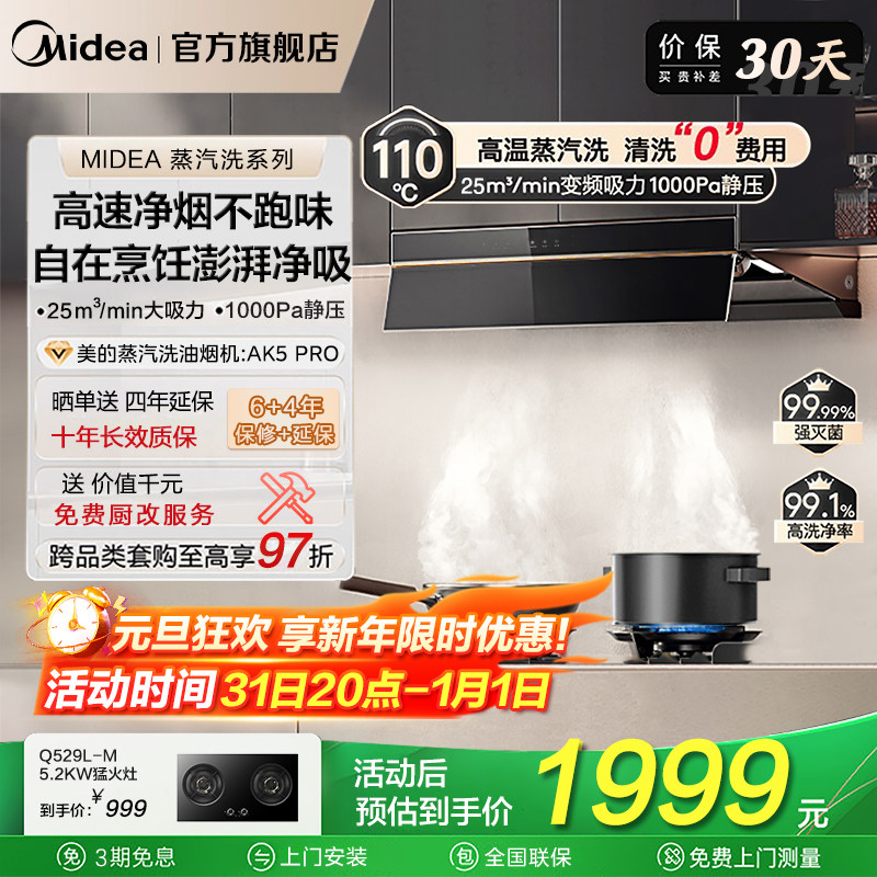 美的AK5pro升级版蒸汽洗油烟机家用厨房大吸力变频自巡航AK3pro