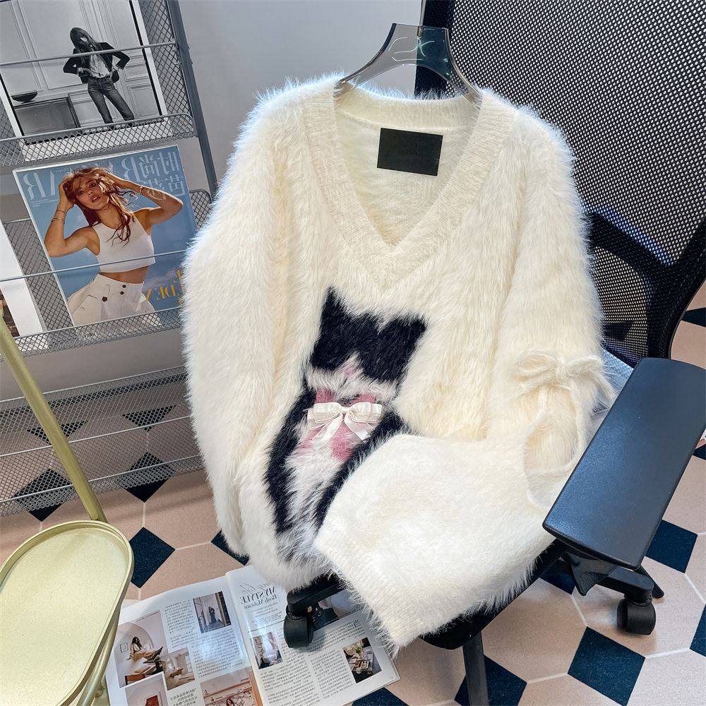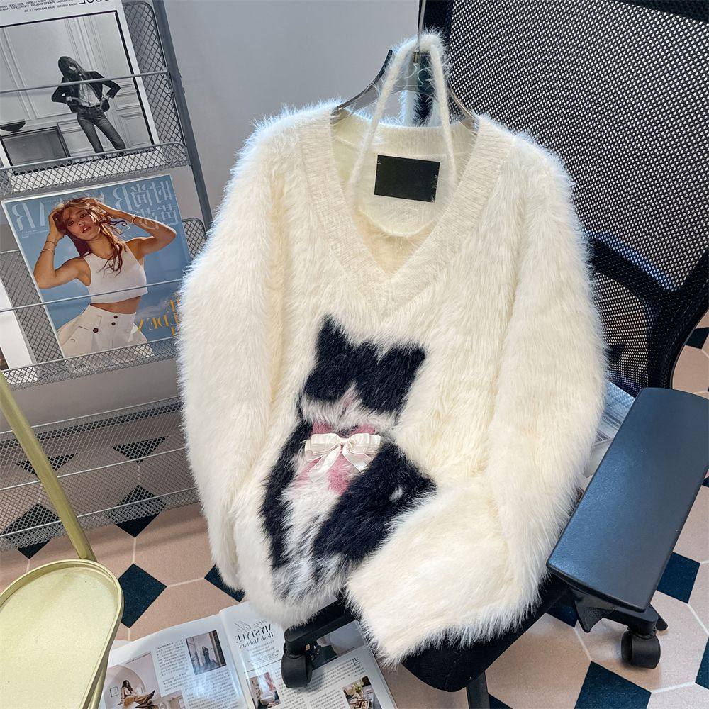 纯欲风v领猫咪毛衣女奶fufu大码内搭水貂绒假两件套挂脖针织上衣