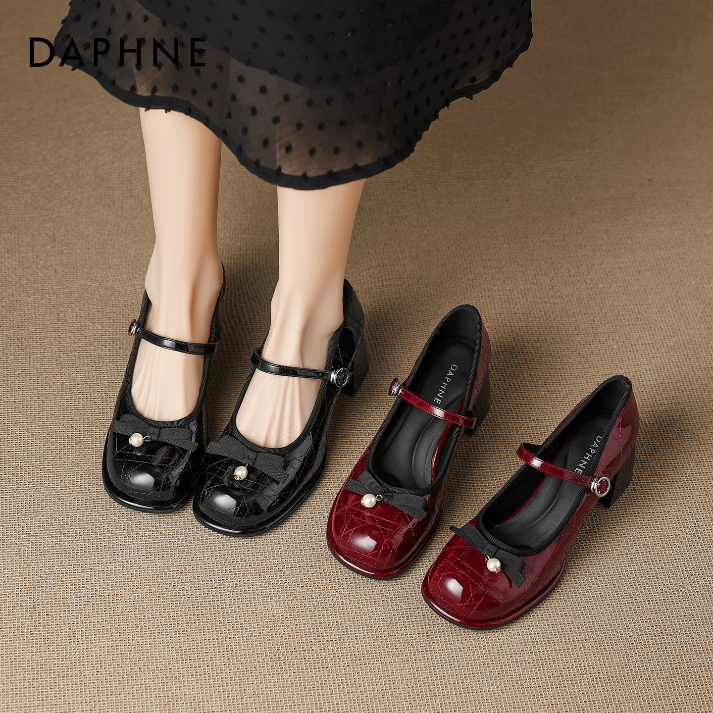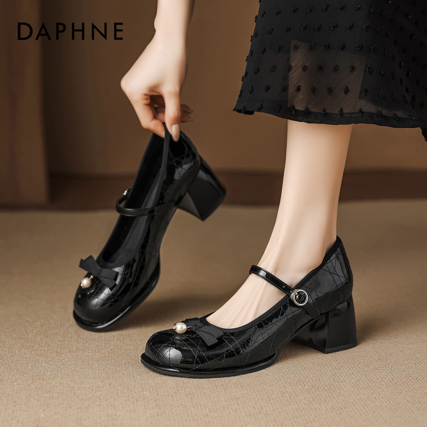 达芙妮法式玛丽珍高跟鞋女2025新款一字扣珍珠粗跟黑色圆头小皮鞋